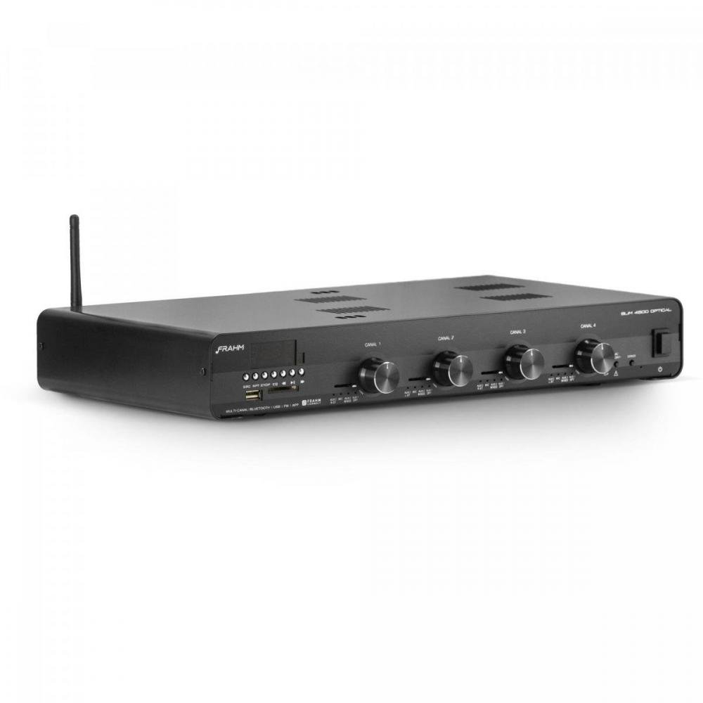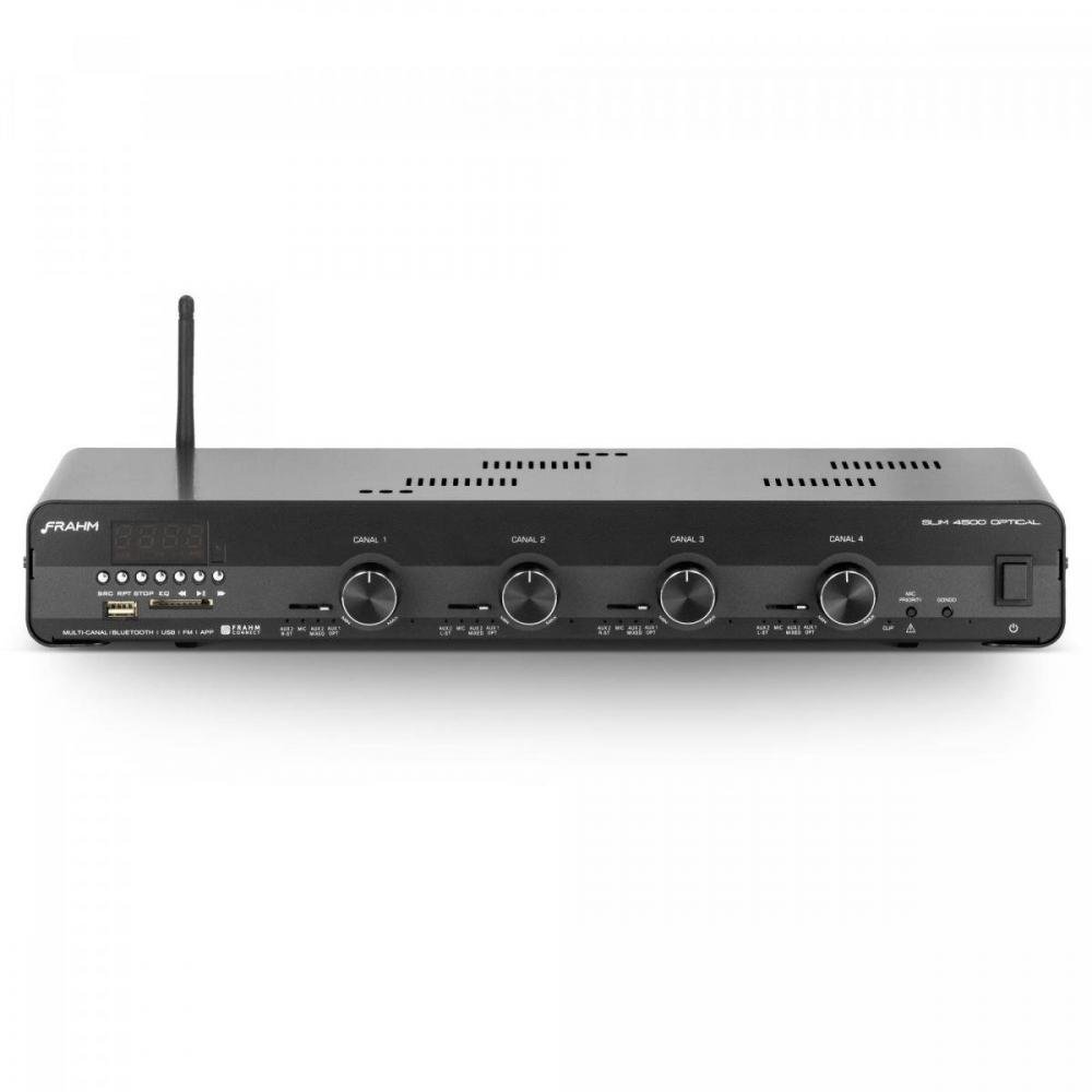O amplificador Slim 4500 Optical possui 480 Watts RMS de potência (4 canais de 120 W RMS) e é ideal para grandes ambientes. Possibilita comando de funções via aplicativo Frahm. Possui conexão USB, SD Card, auxiliar (RCA), Entrada de Microfone balanceado com função “Volume Inteligente” (Baixa a trilha sonora automaticamente quando usado), função gongo (emite sinal sonoro para chamar atenção para uma comunicação), Rádio FM, Bluetooth e entrada de áudio do tipo OPTICAL (para conexão de alta fidelidade sonora dos Televisores atuais).