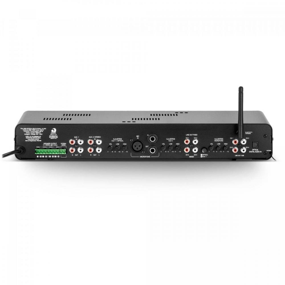 Diferencial: Amplificador que permite fazer 4 setores com controle independente de volume, mesclando dois áudios de fontes diferentes. Também permite ser usado como um amplificador estéreo. Trabalha com impedância mínima de 4 Ohms. É indicado para a instalação de até 60 caixas/arandelas de 8 Ohms cada (15 por canal), preferivelmente com o uso de transformadores tronco e linha.
