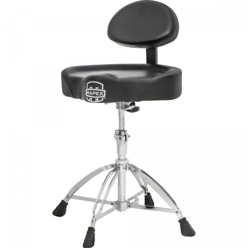 Banco Mapex assento estilo selim com encosto T775, quatro pés com ferragem dupla, regulagem de altura rosqueável, revestimento em vinil.