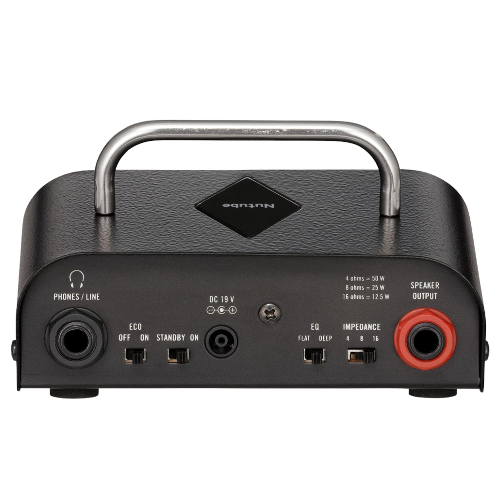 - Cabeçote pré valvulado com 1 x Nutube 6P1 no Preamp - Amplificador classe D com 50 watts (4 Ohms) - Controles de ganho, tom e volume - Função "ECO" que desliga o amplificador automaticamente fique caso sem uso - Chave "stand by" - Chave "EQ" (flat/deep) - Saída para linha/headphone - Saída para caixa - Seletor de impedância (4 / 8 / 16 ohms) - Fonte 19V (incluso) - Altura: 7,40 cm - Largura: 13,50 cm - Profundidade: 10,00 cm - Peso: 540gr