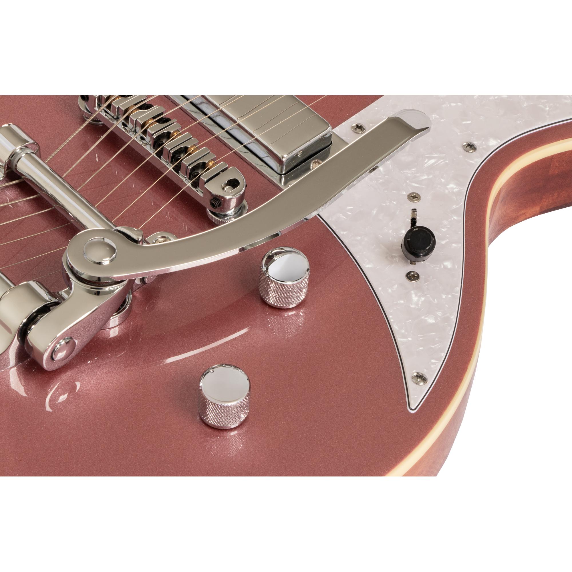 A Guitarra Aria Pro II 212-MK2 Bowery é um modelo que combina design elegante e construção leve, proporcionando um equilíbrio perfeito para ensaios ou até mesmo apresentações ao vivo. Equipada com um par de mini-humbuckers, esta guitarra emite uma ressonância semi-oca pura, repleta de harmônicos ricos de médio alcance.