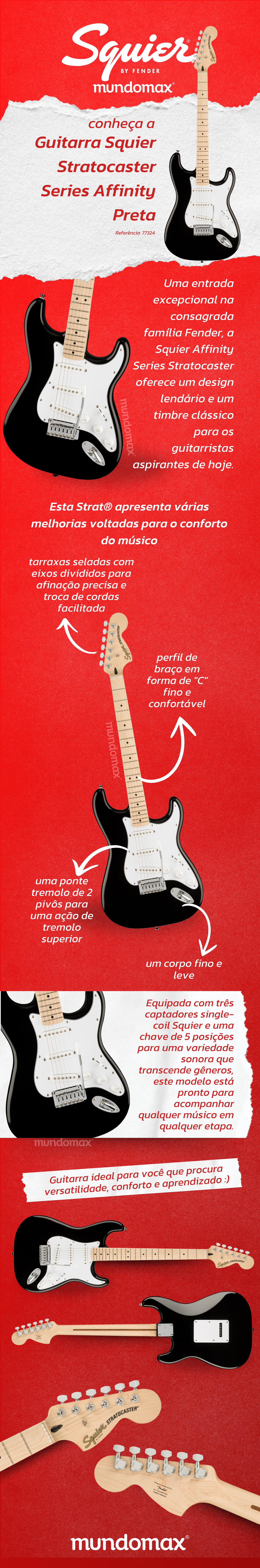 A Guitarra Squier Stratocaster Series Afinnity é uma excelente porta de entrada para a consagrada família Fender, a Squier Affinity Series oferece design lendário e excelente timbre.