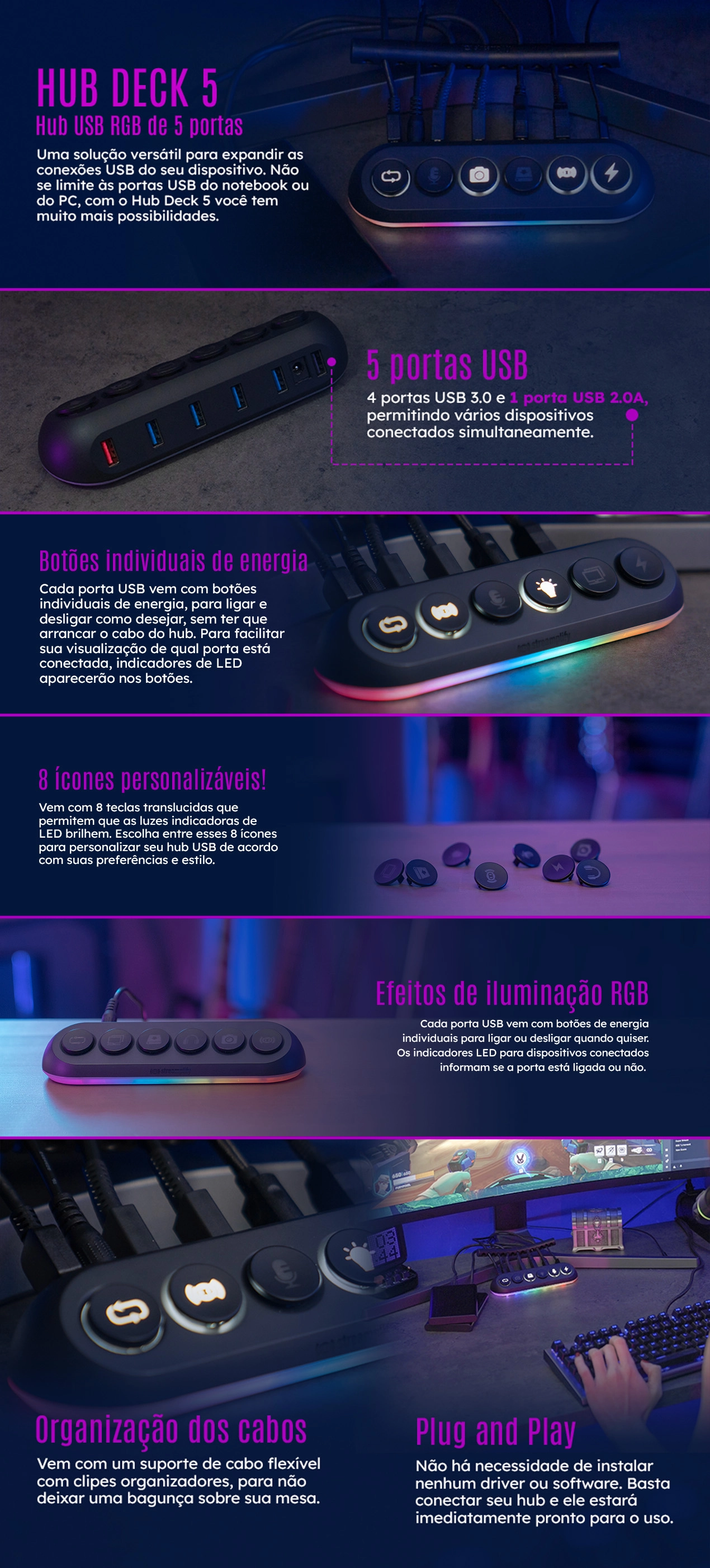 • Número de slot: 5 | 4 x USB padrão 3.0 + 1 x carregamento de energia 2.0