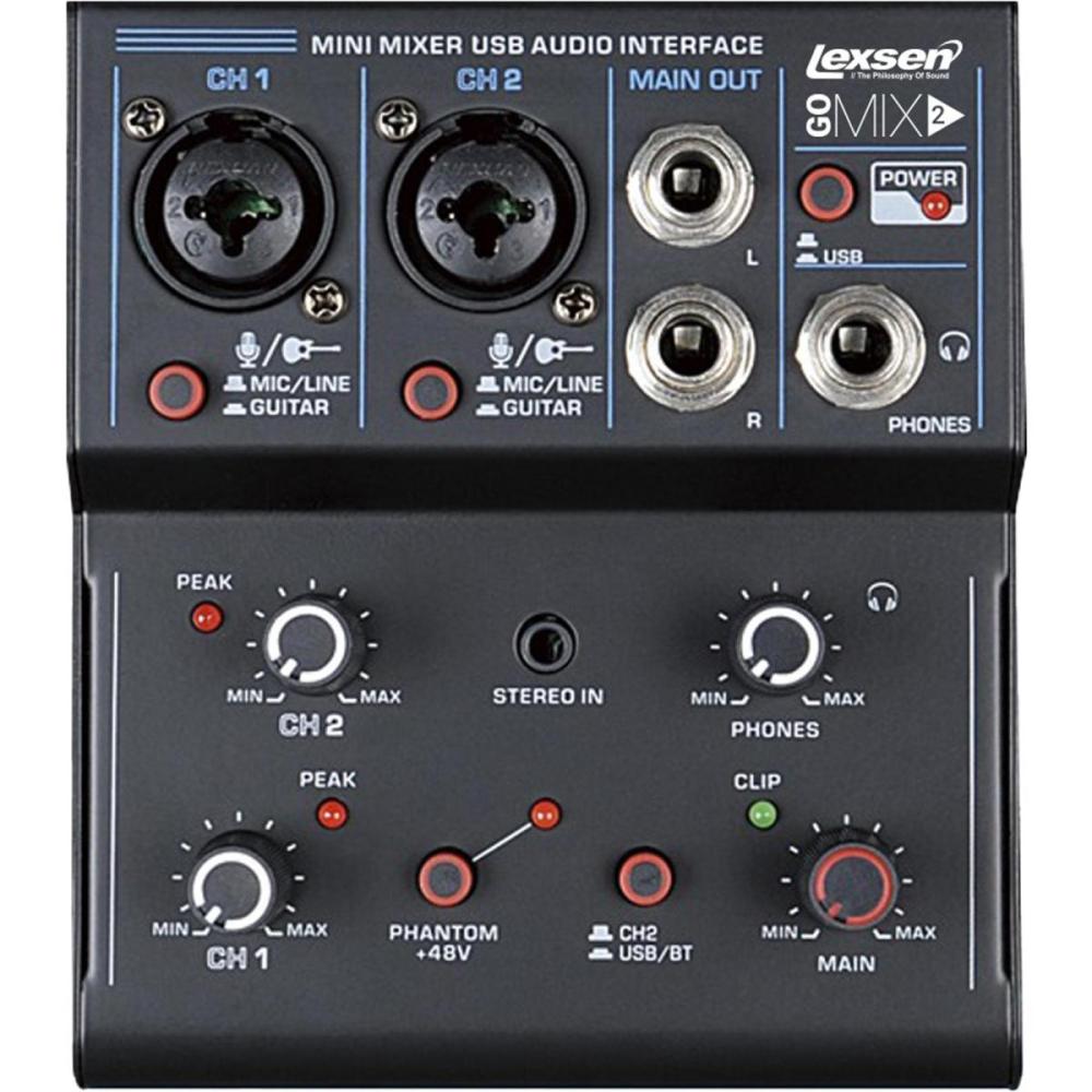 O Go Mix 2 da Lexsen é um mixer analógico de 2 canais com ótimo custo benefício, ideal para pequenos e médios eventos. Construído em resistente gabinete metálico com pintura epóxi, o Go Mix 2 conta com 2 entradas combo (XLR/P10) podendo estas serem usadas tanto para microfones quanto para instrumentos. Outro grande diferencial do Go Mix 2 é o fato dele contar também com entrada USB e Bluetooth, permitindo você conectar o seu smartphone diretamente com a mesa, e, o melhor de tudo, transformando-o em uma interface de áudio. O Go Mix 2 possui ainda uma entrada auxiliar estéreo. Na saída, o Go Mix 2 apresenta uma conexão RCA (L/R) e uma saída de fones P10. O Go Mix 1 possui Led indicador de PEAK e CLIP, importante para avisar que é preciso diminuir o ganho na mesa a fim de não saturar os alto-falantes. Para facilitar ainda mais o seu dia a dia, o Go Mix 1 possui Phantom Power +48V para ligar o seu microfone condensador.