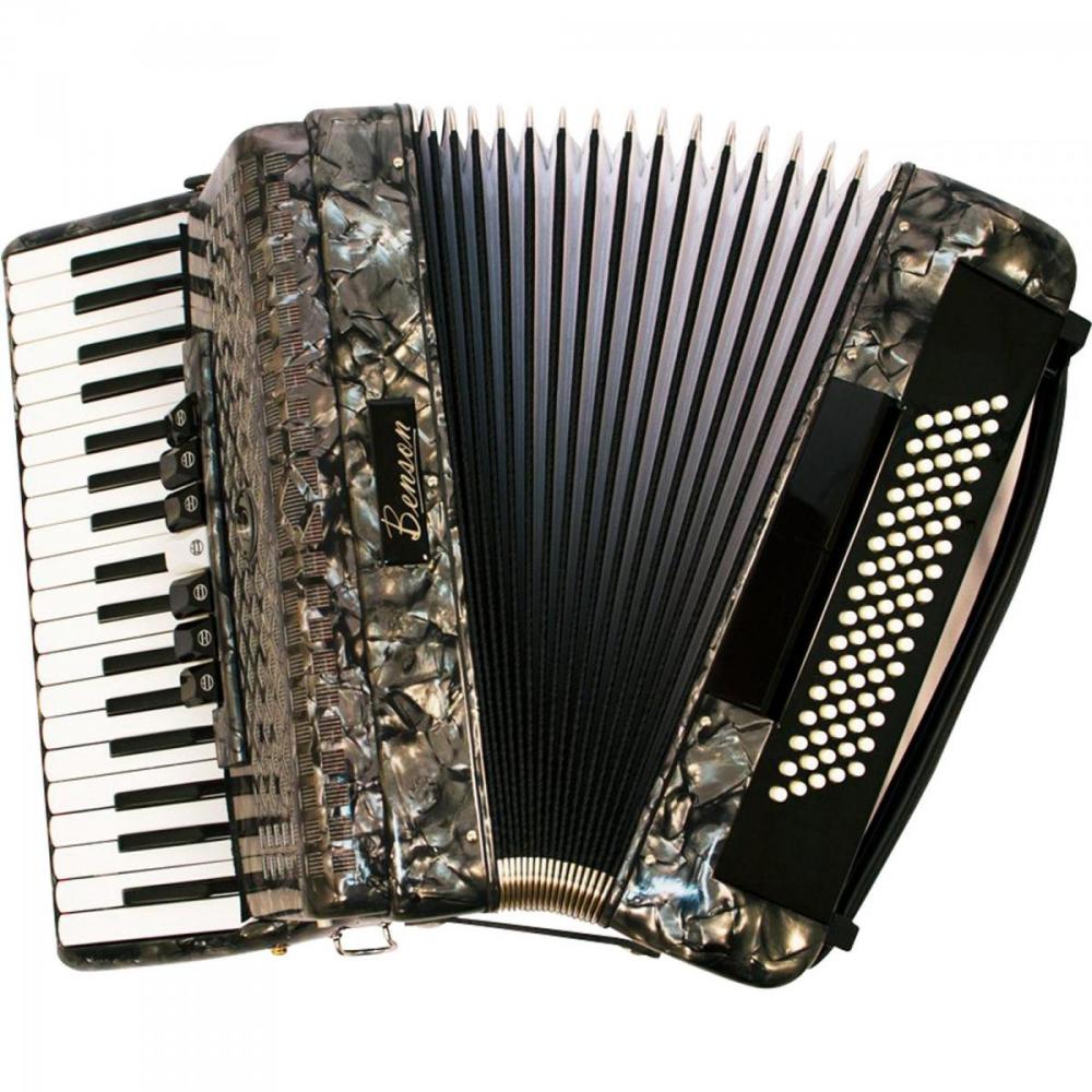 O acordeon Benson é montado com palhetas de aço inoxidável ultra resistentes, construídas para resistir a utilizações longas, frequentes e intensas. Possui fole em linho e couro, e uma construção ressonante que lhe garante um som encorpado e vibrante. Sua estrutura permite ao músico uma tocabilidade confortável e firme, com graves encorpados e agudos intensos, sendo ideal para diversos estilos musicais, como Sertanejo, Folk, Forró, Gauchesca e Tango. Os modelos acompanham bag em tecido reforçado para maior praticidade e comodidade do acordeonista ao carregar seu instrumento.