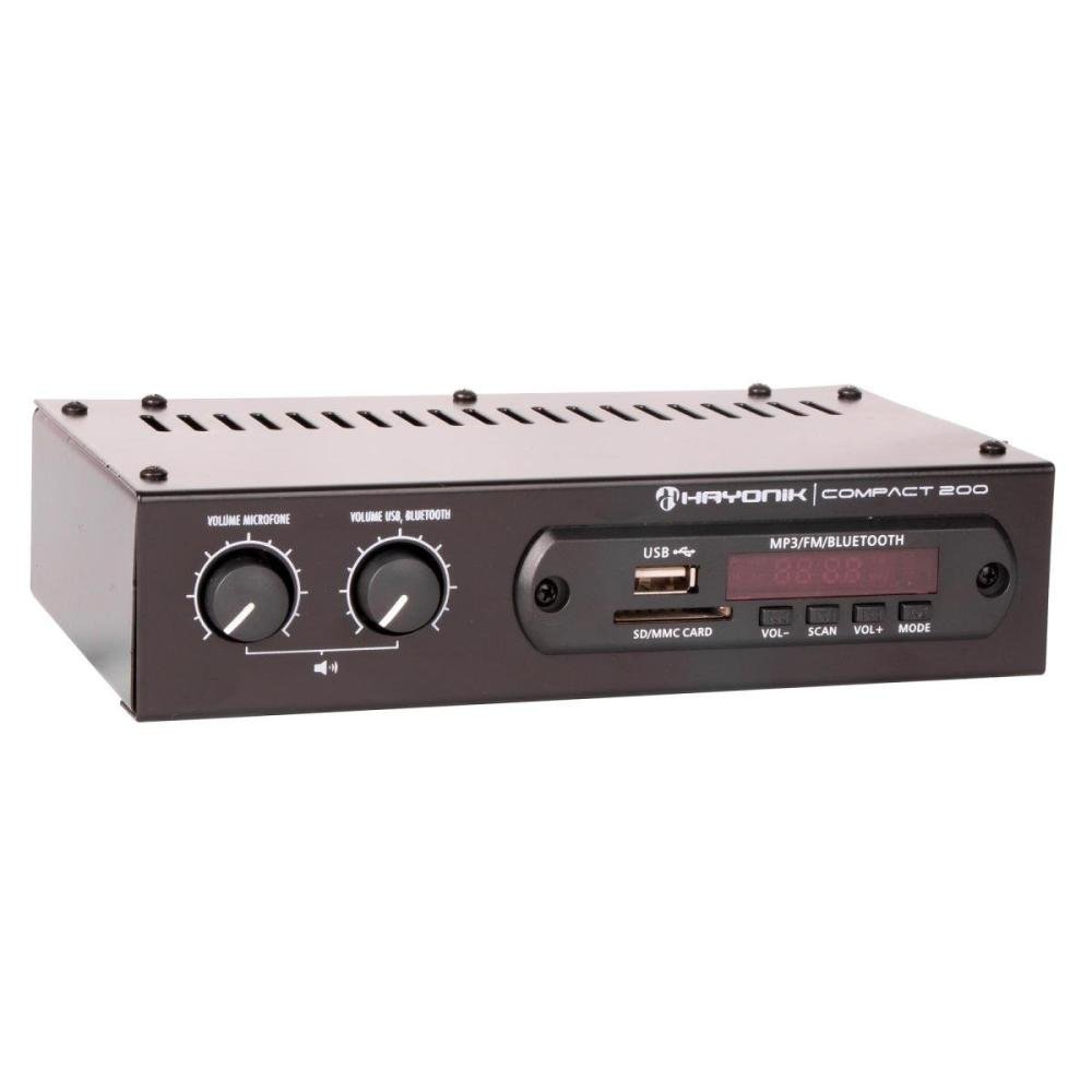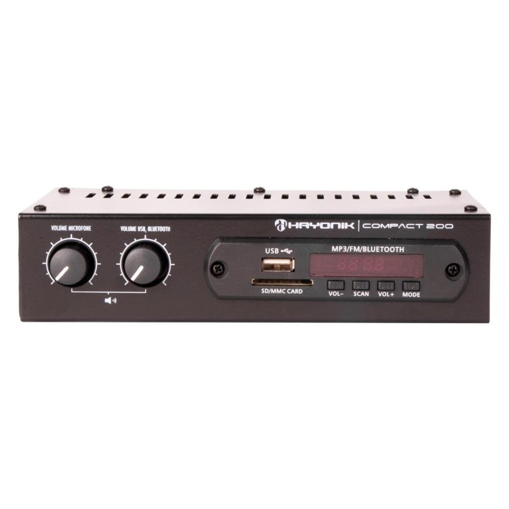 O Amplificador Hayonik Compact 200 é um modelo versátil, prático e de fácil manuseio. Possui entrada USB, SD, AUX RCA, Microfone, Rádio FM e Bluetooth. É leve, compacto e de fácil instalação. É o produto ideal para quem busca praticidade e qualidade por um baixo custo.