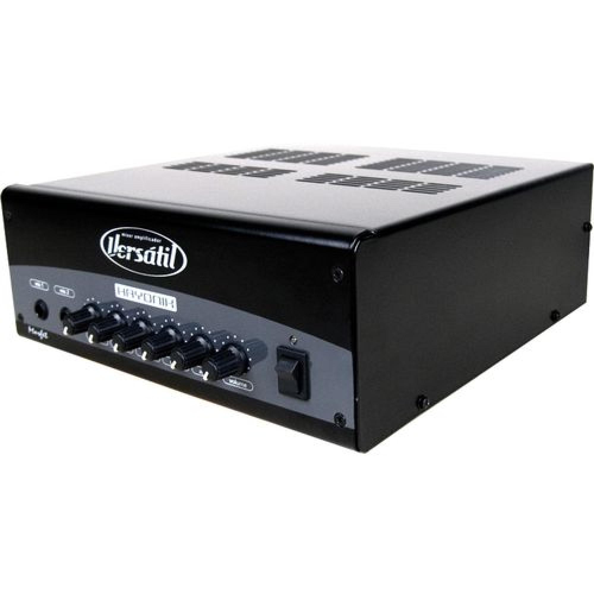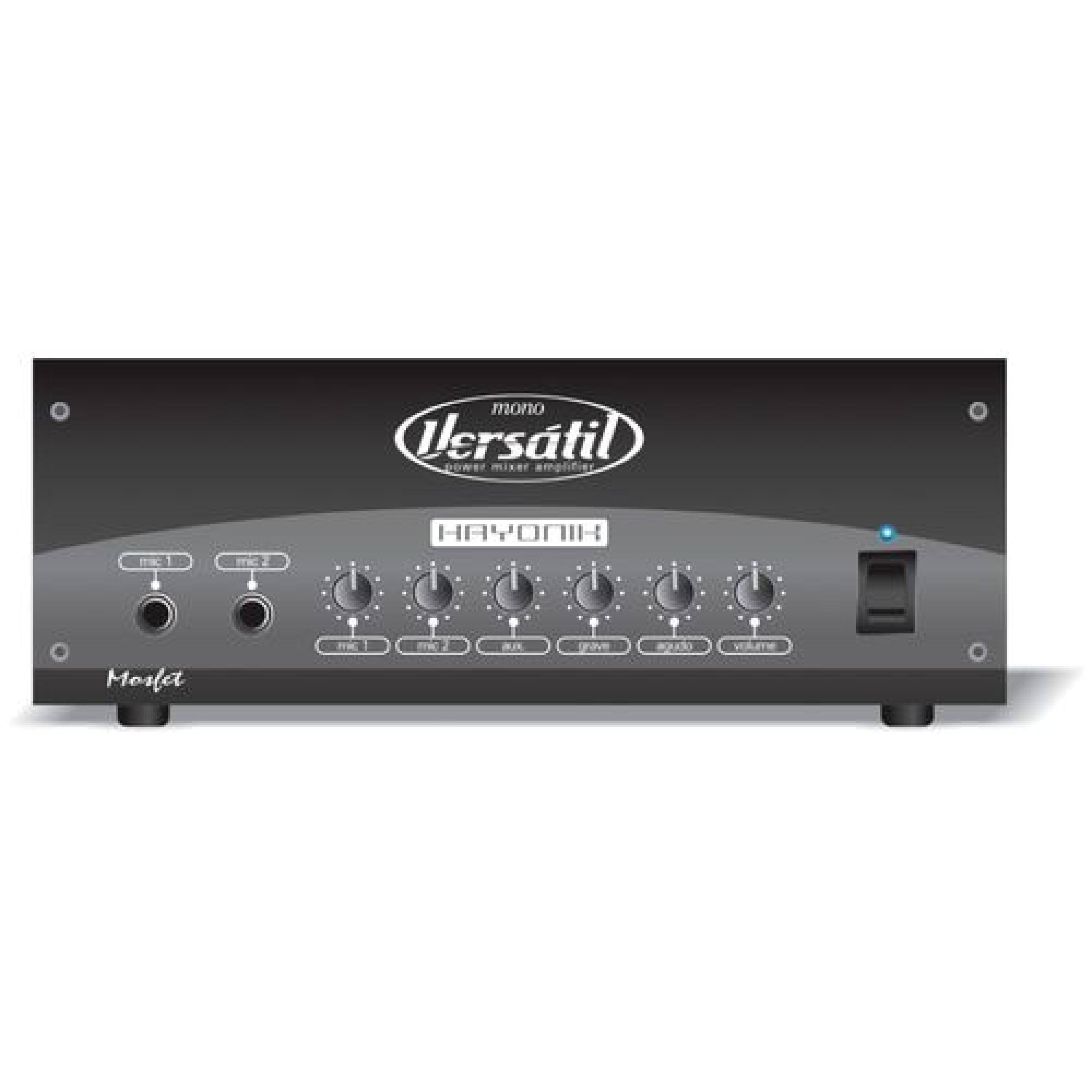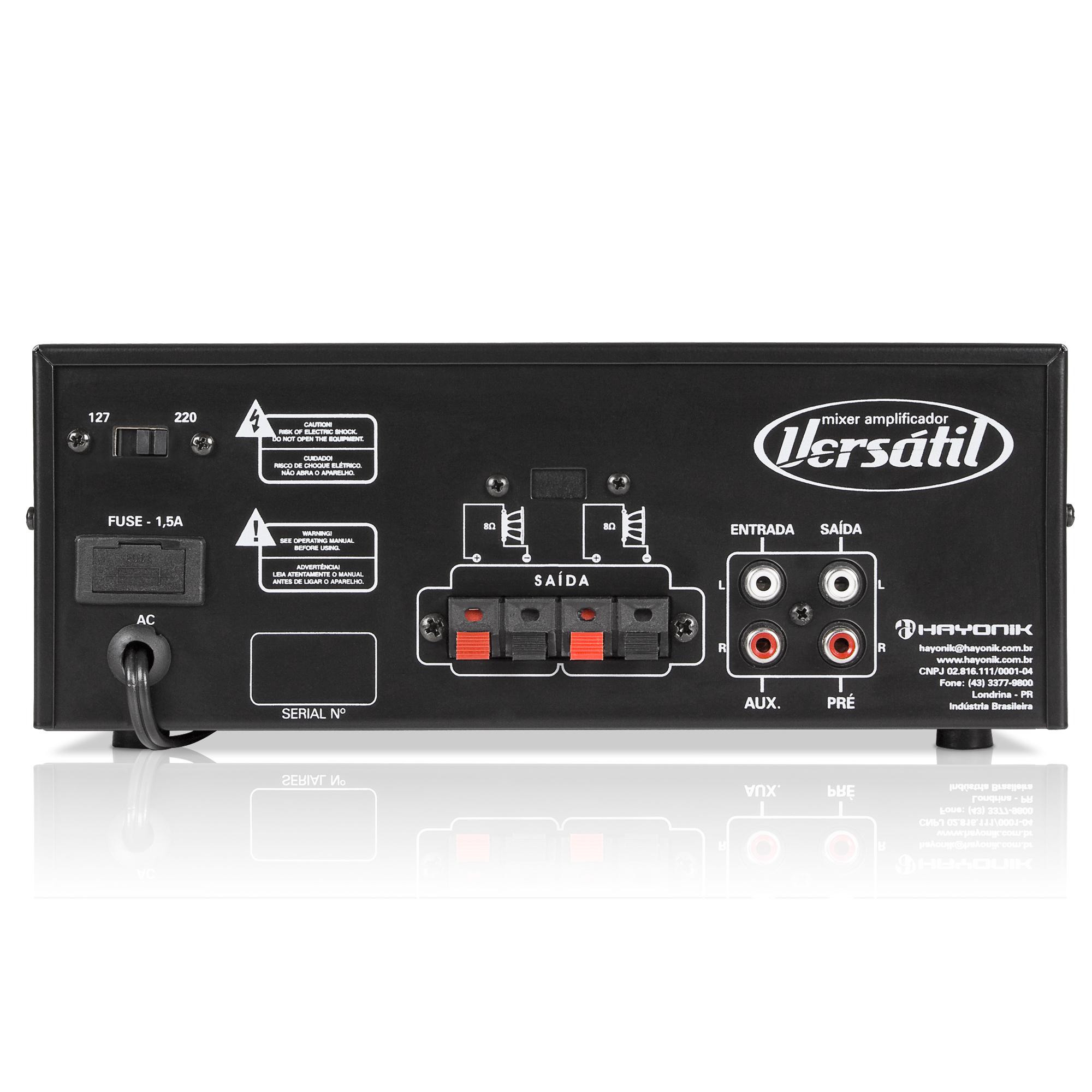 O Amplificador Versátil mono possui sistema de proteção contra tensões DC nas saídas de caixas acústicas, curto circuito nas linhas de áudio e contra alta temperatura. Contém ainda um pré-amplificador mixer de alta fidelidade com controles tonais de 02 vias e entradas que permitem a mixagem de várias fontes musicais: DVD; violão, guitarra, PC, discman e etc...