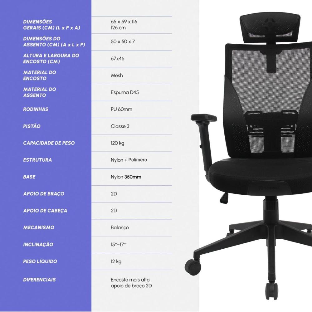 • Mesh respirável: tecido que mantém a ventilação ideal, evitando o calor em longas horas sentado.
