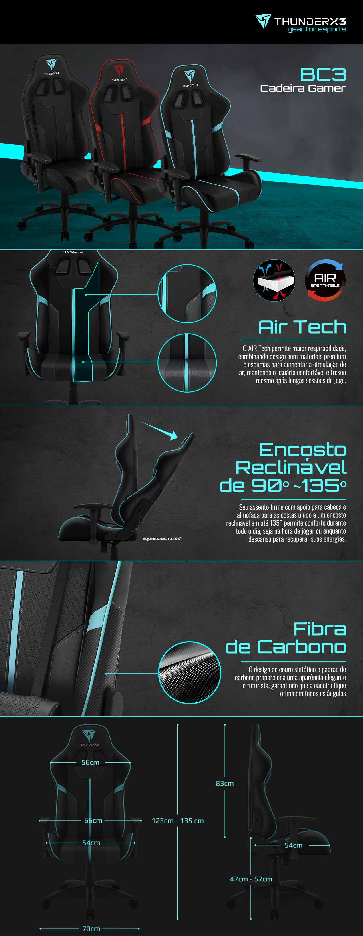 O apoio de braço com ajuste 2D é outro aliado importante no conforto que a BC3 oferece, podendo ser usados em duas direções os apoios são perfeitos para posicionar os cotovelos mais corretamente durante o jogo. Esse modelo também conta com ajuste pneumático de altura e rotação de 360 graus, é uma cadeira recomendada para jogadores até 125 kg. Fabricada com um design exclusivo aliado a resistência, possui base resistente de metal, rodas de nylon, que garantem movimentos mais suaves, e moldura de metal resistente, a BC3 possibilita um suporte estável e confiável já característicos das cadeiras Thunderx3.