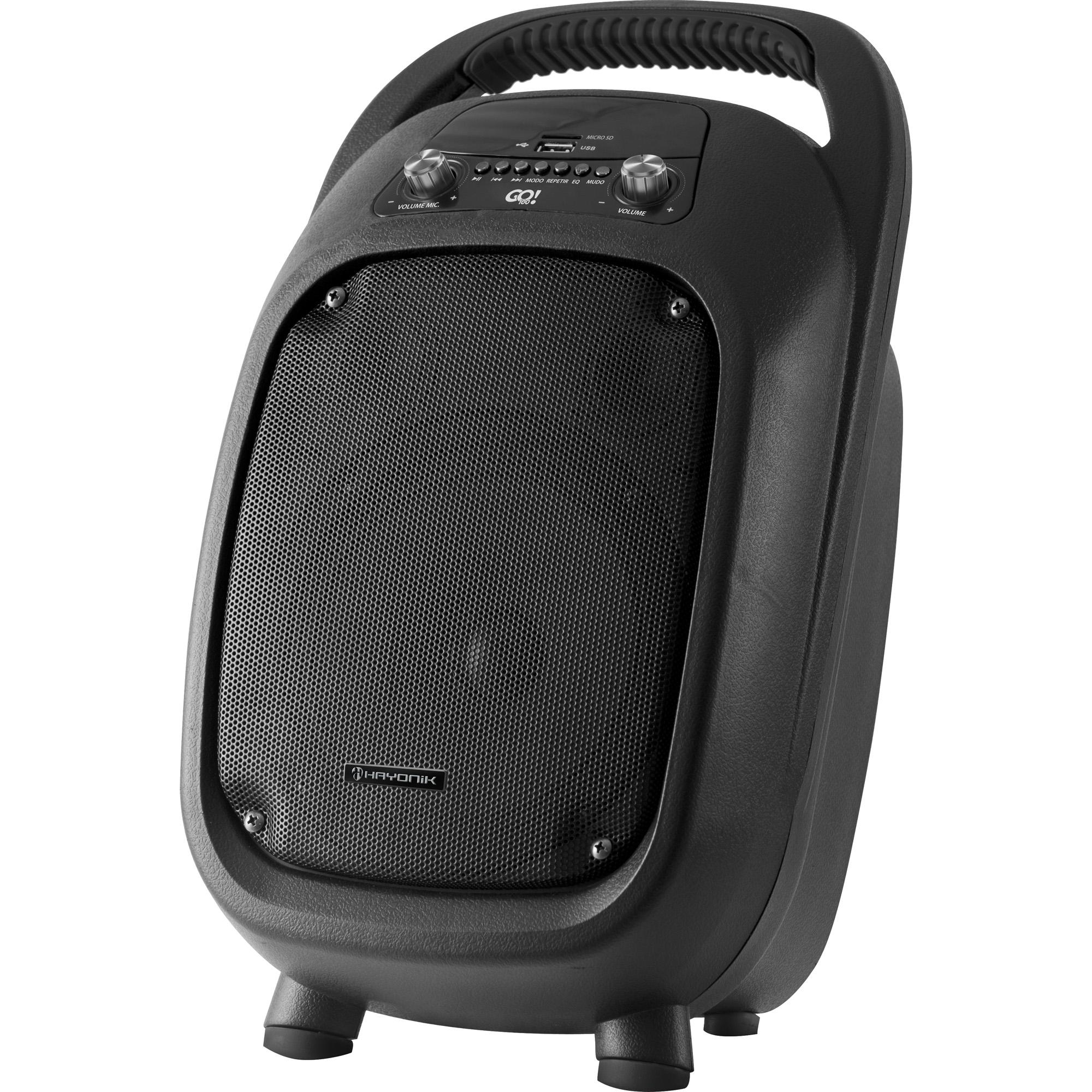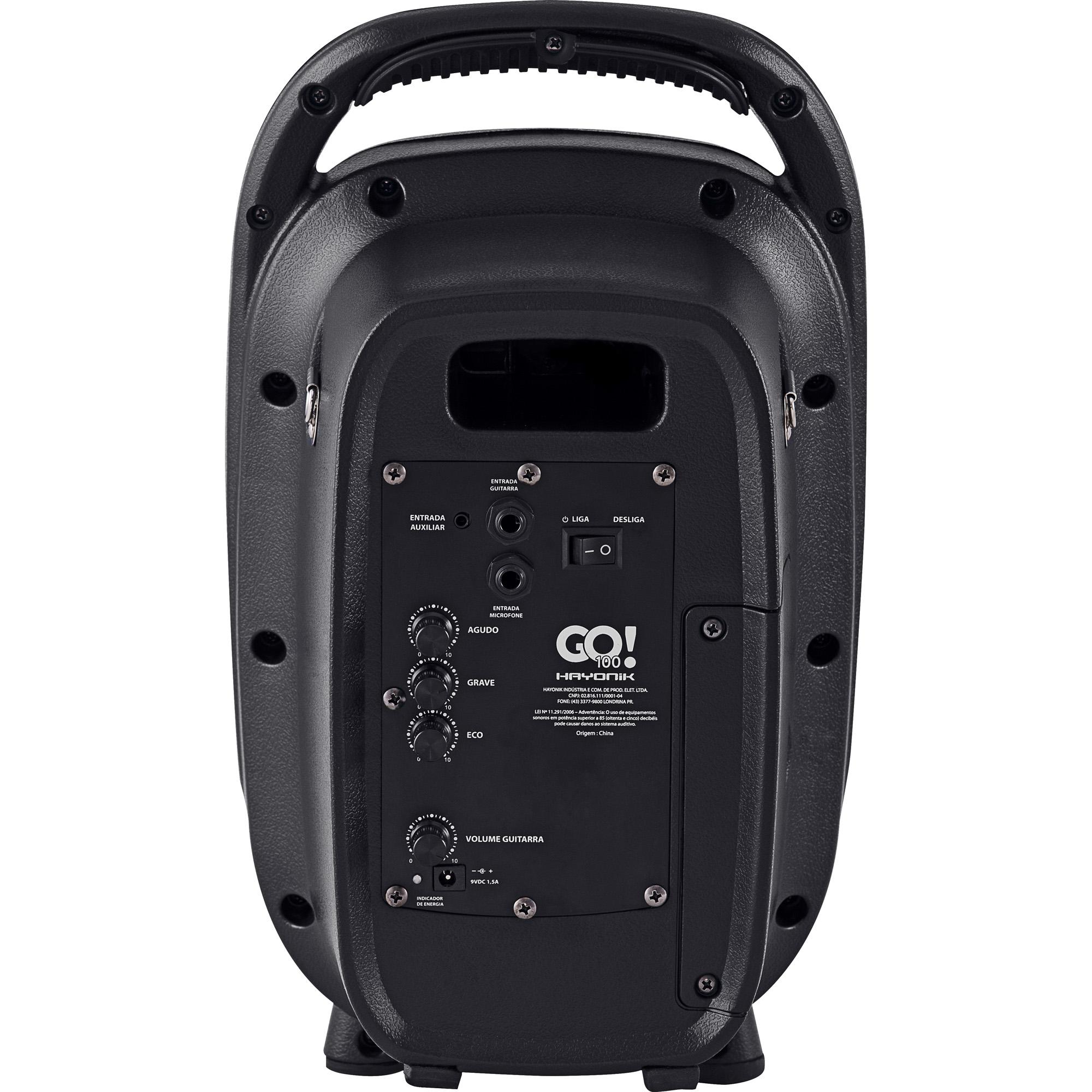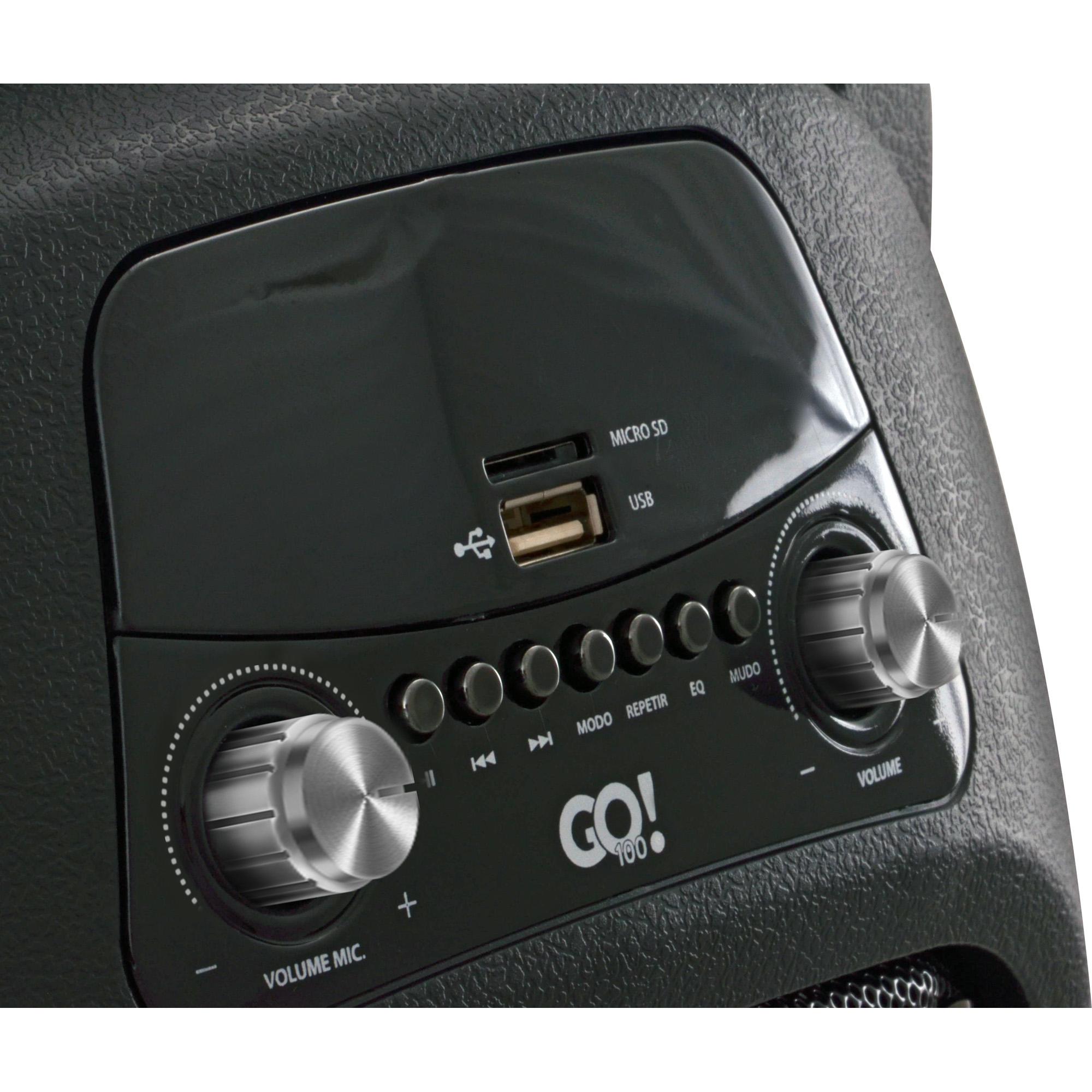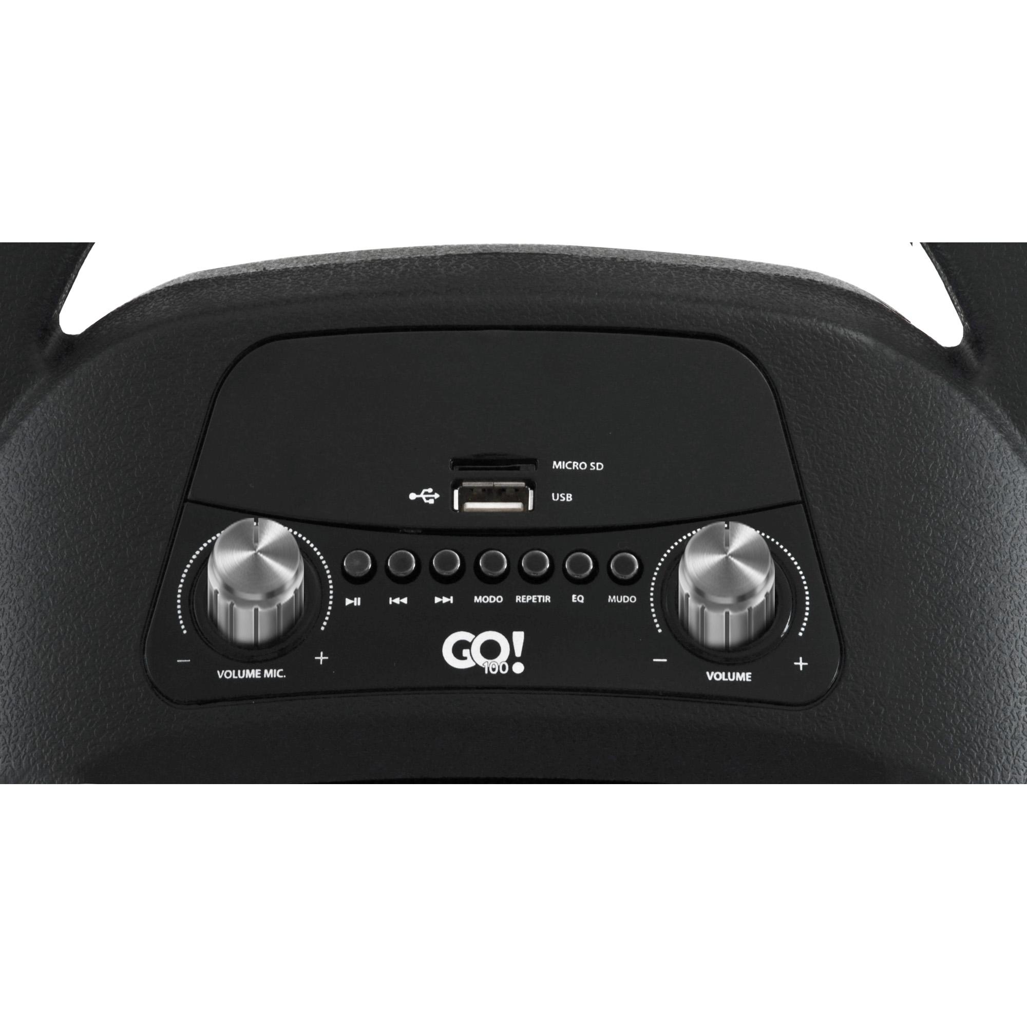 - Itens Inclusos: 1 Caixa de Som Amplificada GO!100 com Bateria, 1 Microfone, 1 Controle Remoto, 1 Fonte Bivolt, 1 Manual do Usuário.
