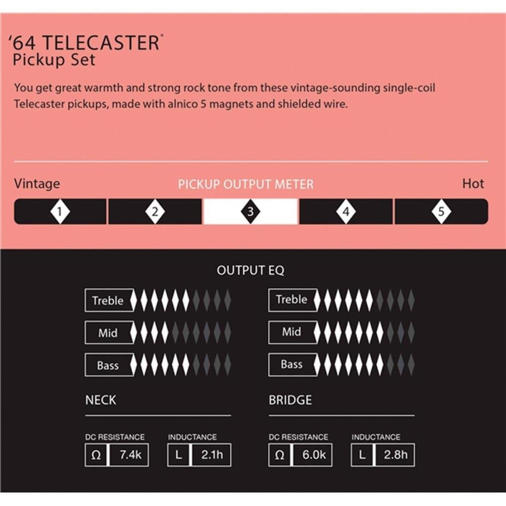 Feitos em Alnico 5, os Captadores Fender Pure Vintage ‘64 Kit Telecaster têm um timbre quente, de média saída e som cristalino.
