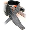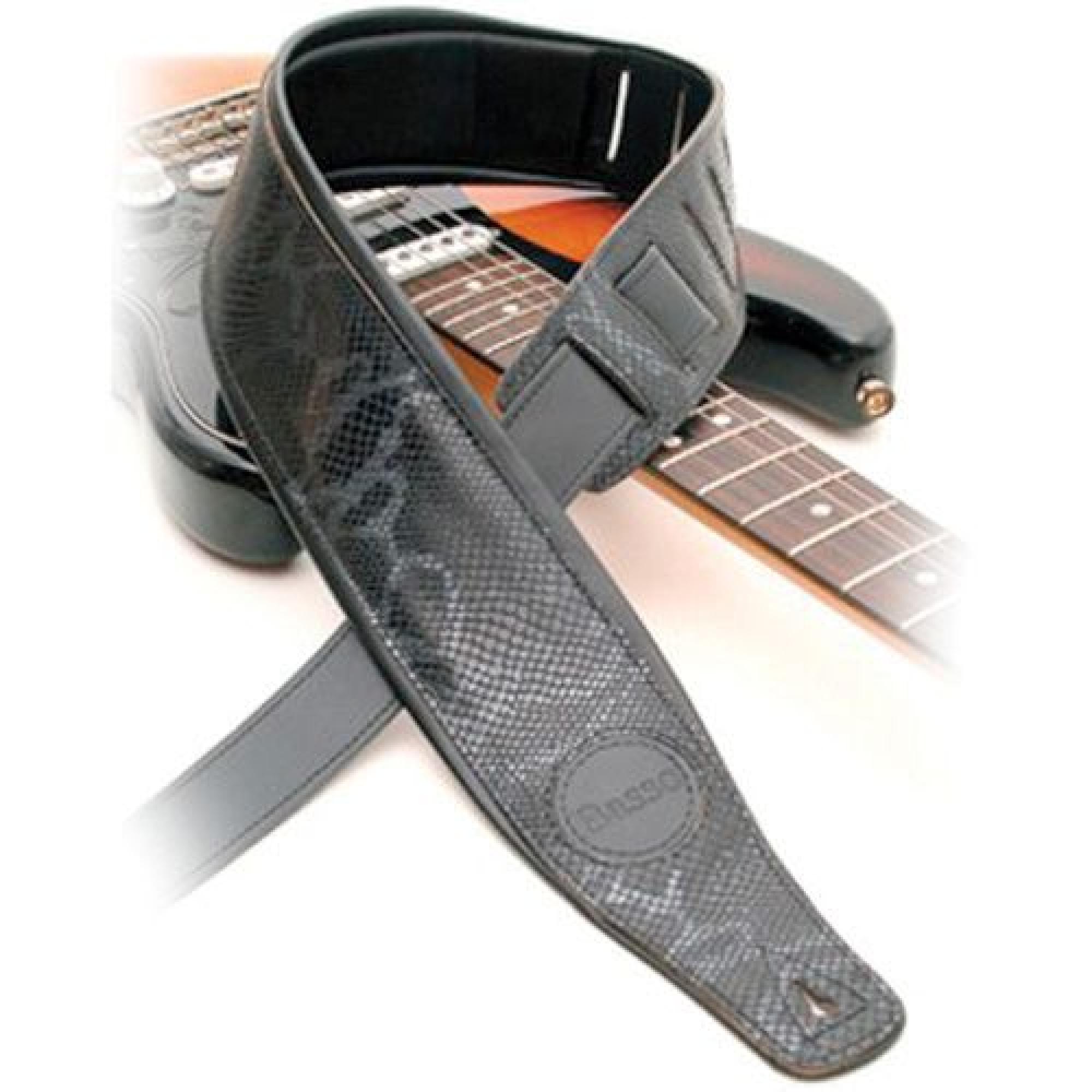 Correia estofada em couro vaqueta imitando cobra python preta. Forrada com sintético para evitar a absorção do suor, deslizando sobre o ombro do músico.