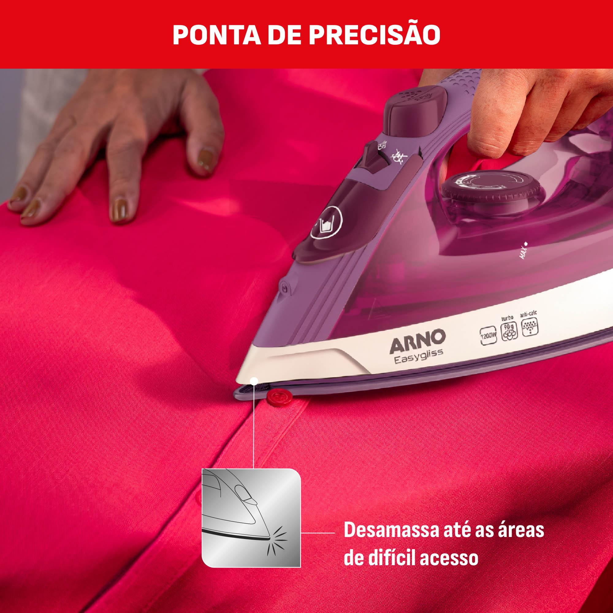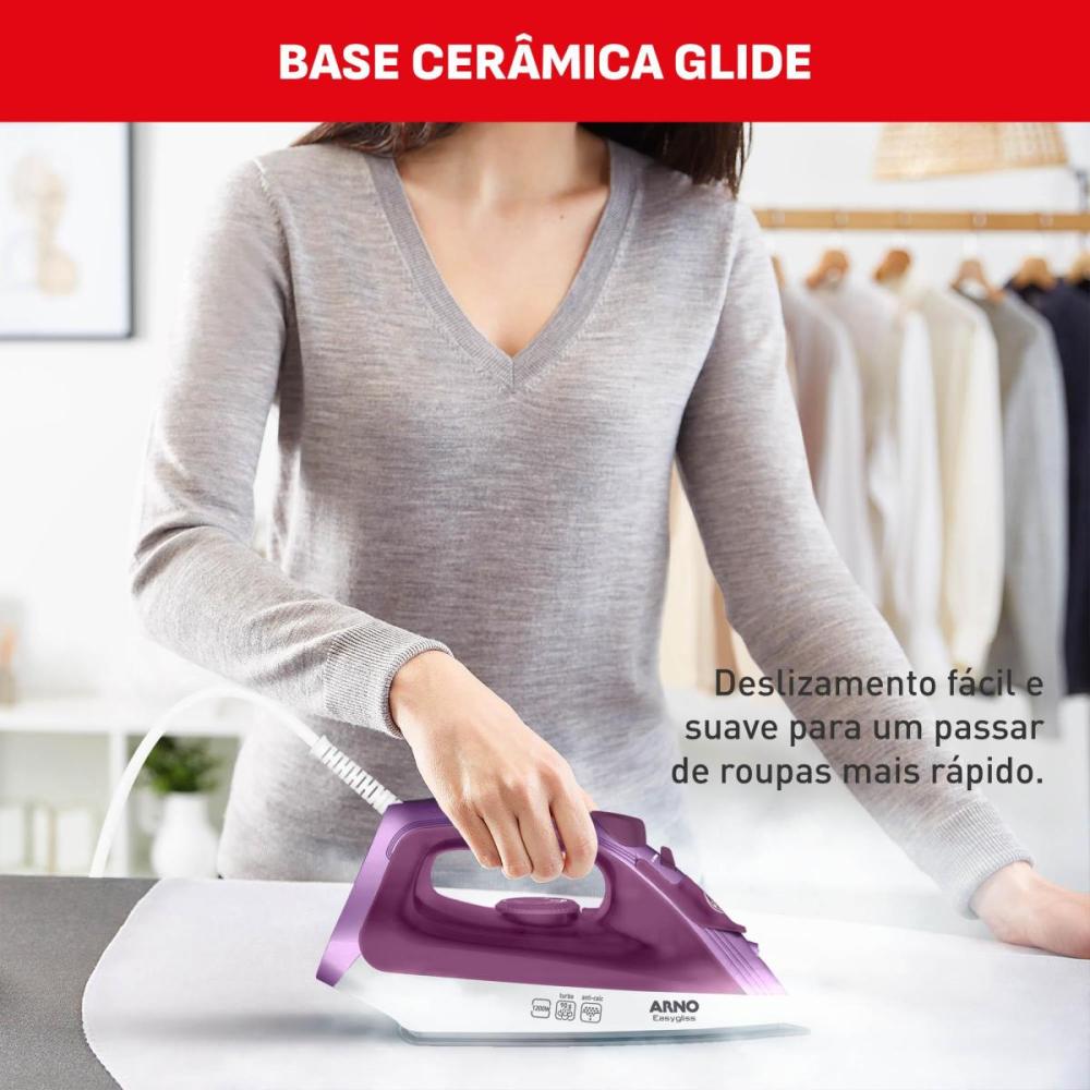 O Ferro a Vapor Arno Easygliss foi desenvolvido para tornar o cuidado com as roupas mais prático e eficiente. Com design robusto e tecnologia avançada, ele conta com a exclusiva base em Cerâmica Glide, que proporciona um deslizamento suave sobre os tecidos, reduzindo o esforço ao passar.
