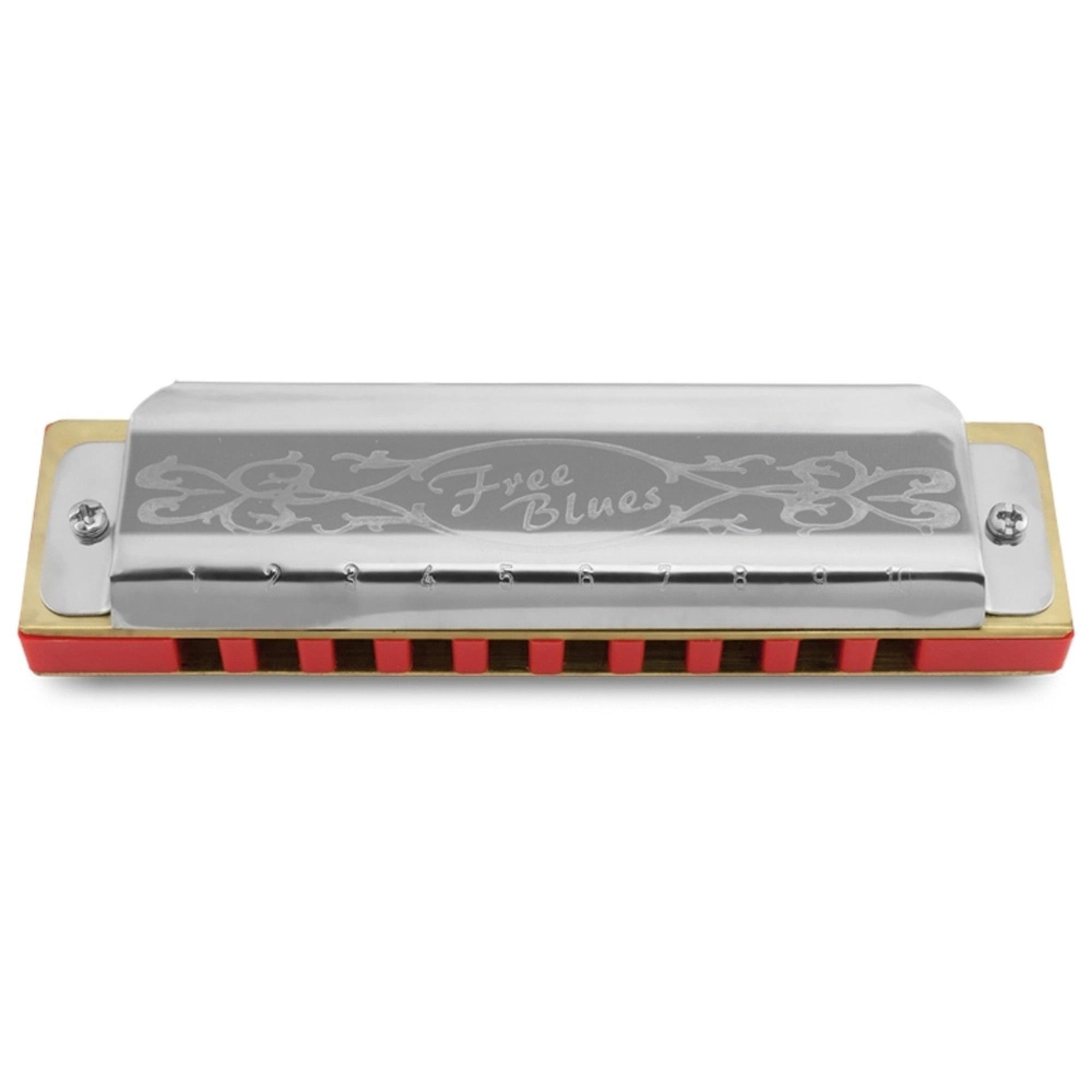 A Gaita de Boca Free Blues HERING possui uma placa de cobertura de aço inox e corpo de plástico na cor vermelha. Possui também uma placa de vozes de latão com espessura de 0,90 mm e palhetas de latão.