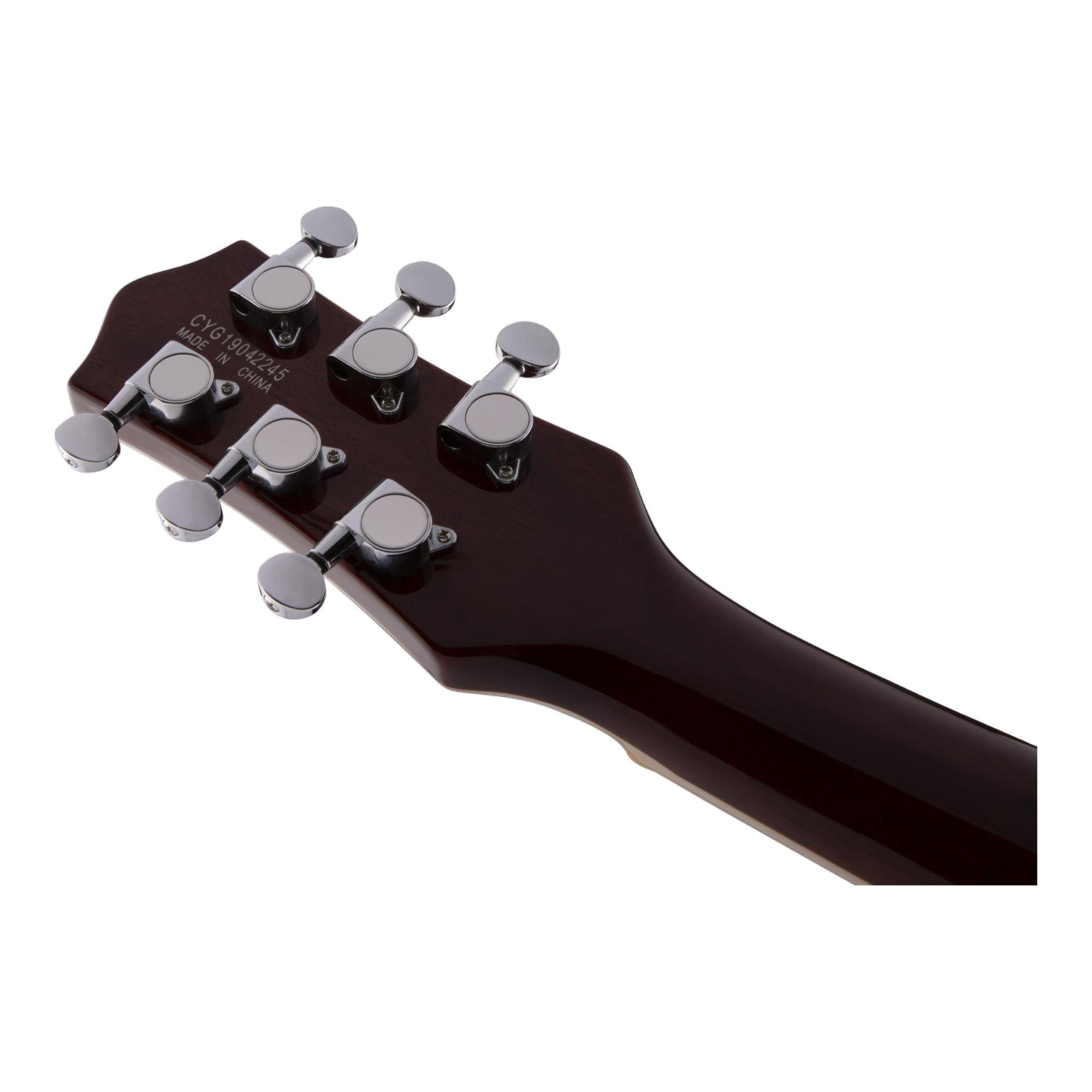 No coração da G5220, você encontrará um corpo em mogno com câmara e um tampo em maple, que proporciona um perfil sonoro rico e equilibrado, enfatizando os graves encorpados e os agudos brilhantes. Os novos captadores Black Top Broad'Tron™ oferecem uma potência impressionante, permitindo que você transite facilmente de um som overdrive agressivo para um timbre limpo e cristalino, mantendo a definição e o equilíbrio das notas em seu mais alto nível.
