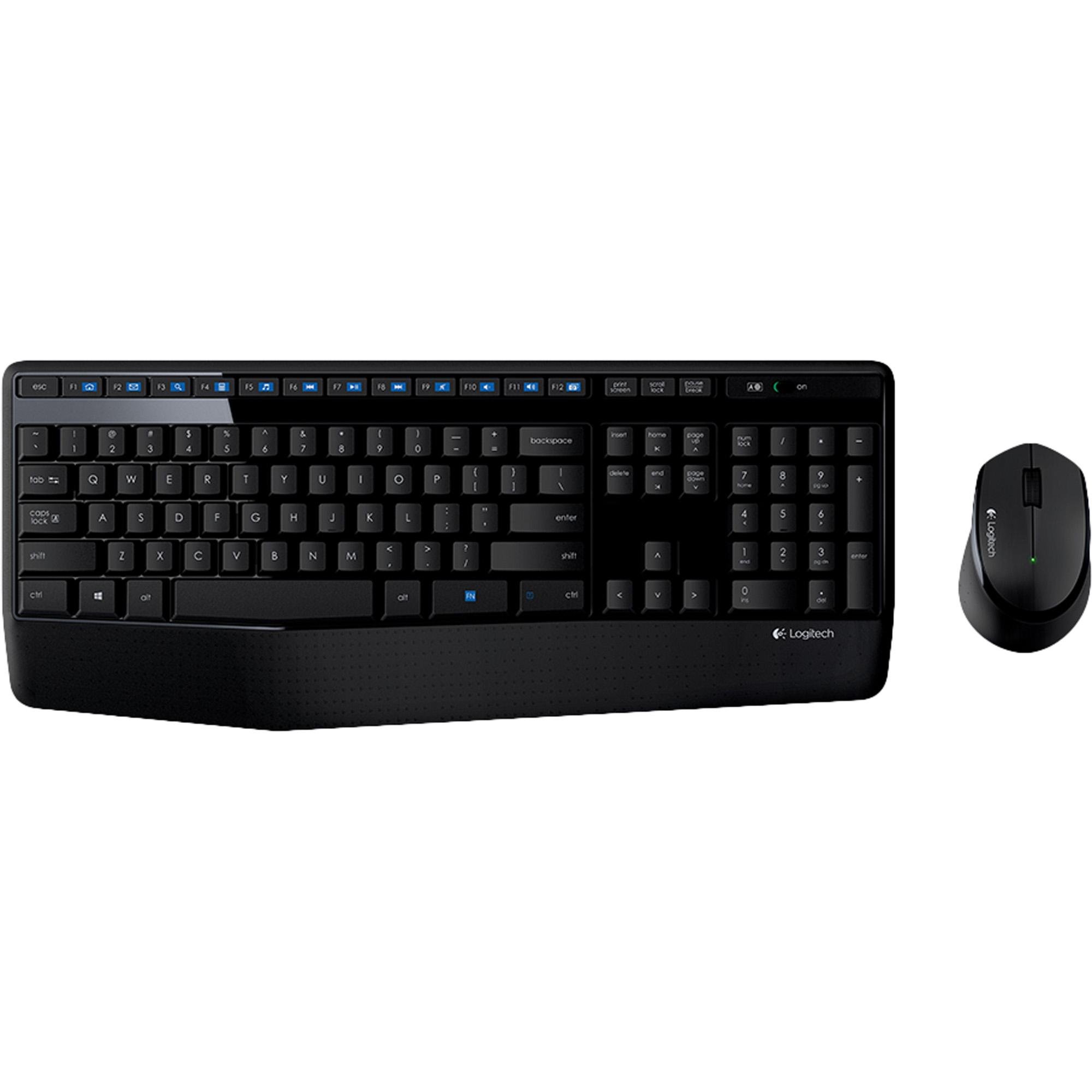 O Kit LogitechR Wireless Combo MK345 une um teclado grande e confortavel, e um mouse para destros. O teclado e fornecido com um apoio para as maos confortavel e setorizado, um design resistente a respingos, um acabamento lustroso e uma luz de indicacao de caps lock.