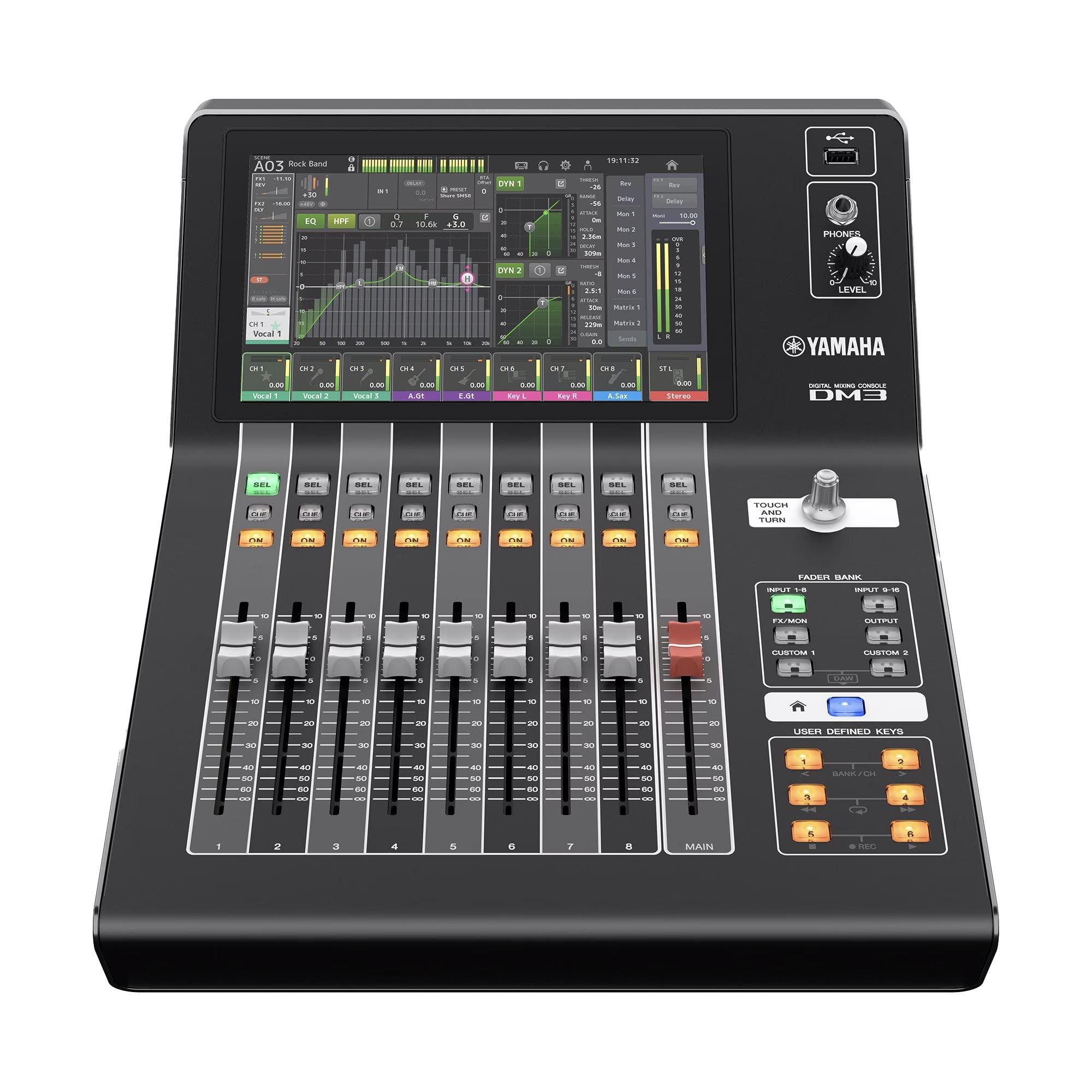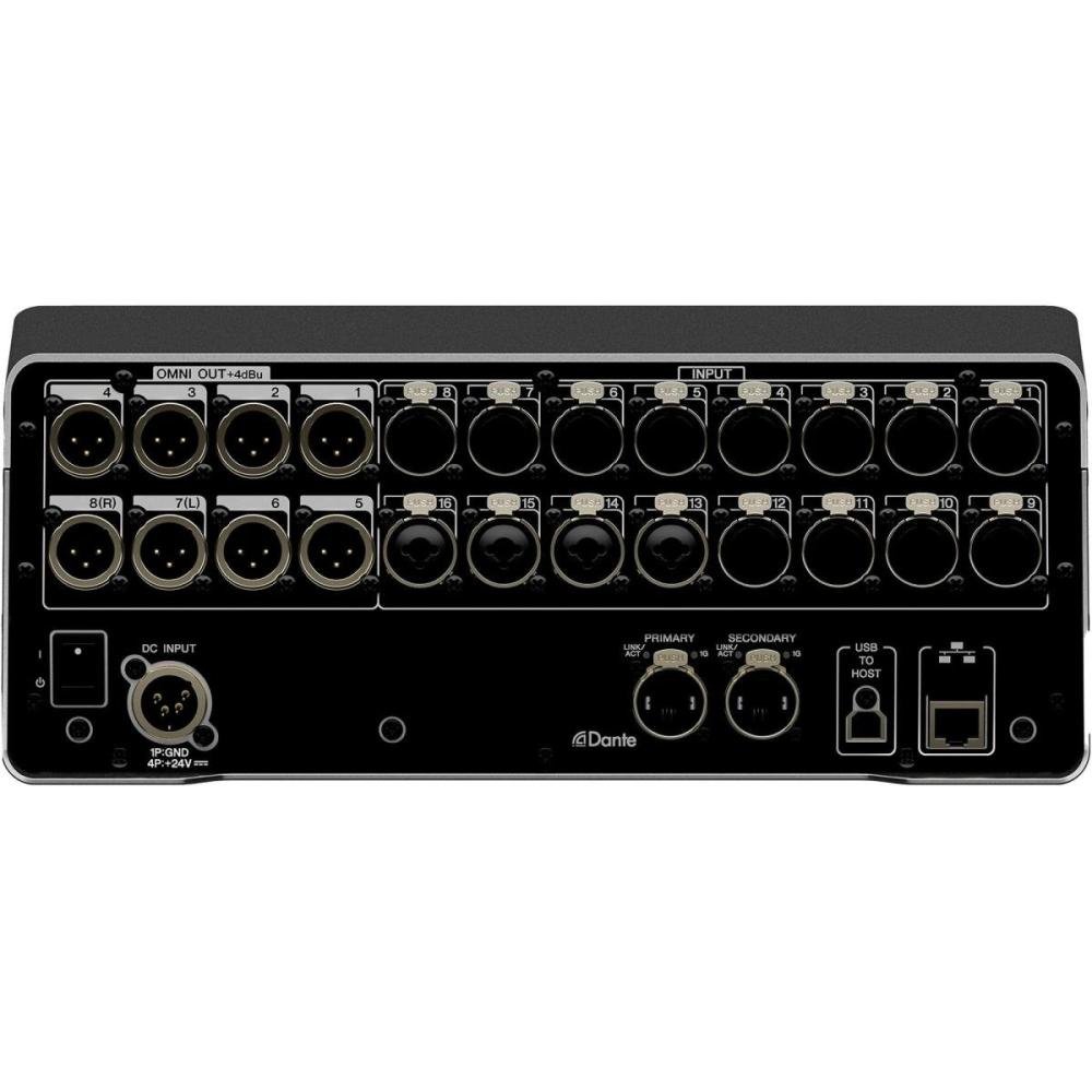 • Interface do Usuário: 1x tela multitoque de 9 polegadas, 9x faders (8 canais + 1 principal), 1x codificador rotativo "Touch and Turn"
