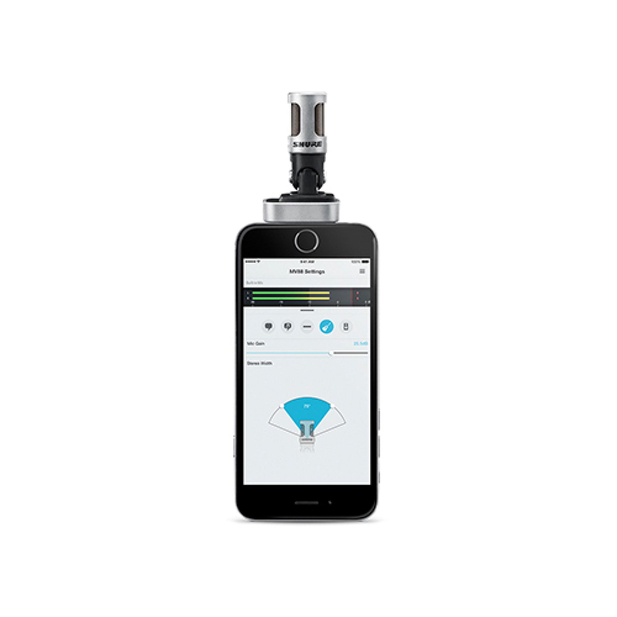 O microfone condensador digital estéreo Shure MOTIV MV88 pode ser conectado ao seu iPhone, iPad ou iPod com conector Lightning para gravar áudio em estéreo supernítido em qualquer lugar. Com sua dobradiça giratória, o microfone pode ser colocado em qualquer posição, mesmo em aplicações de vídeo.