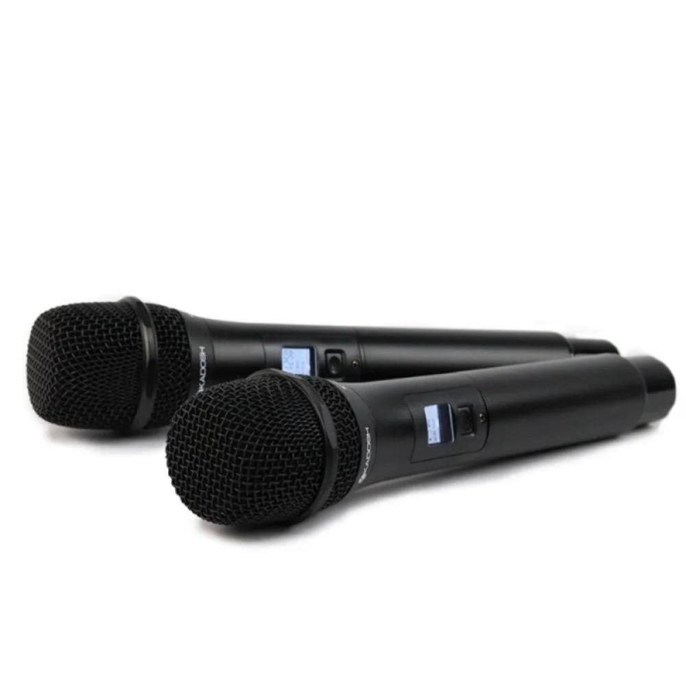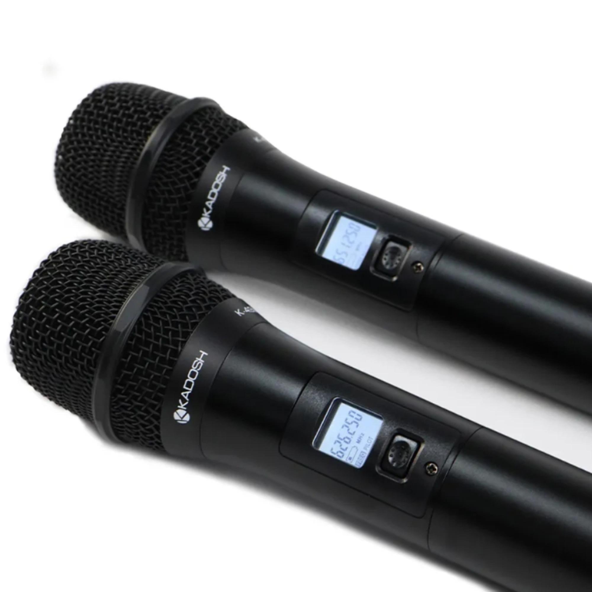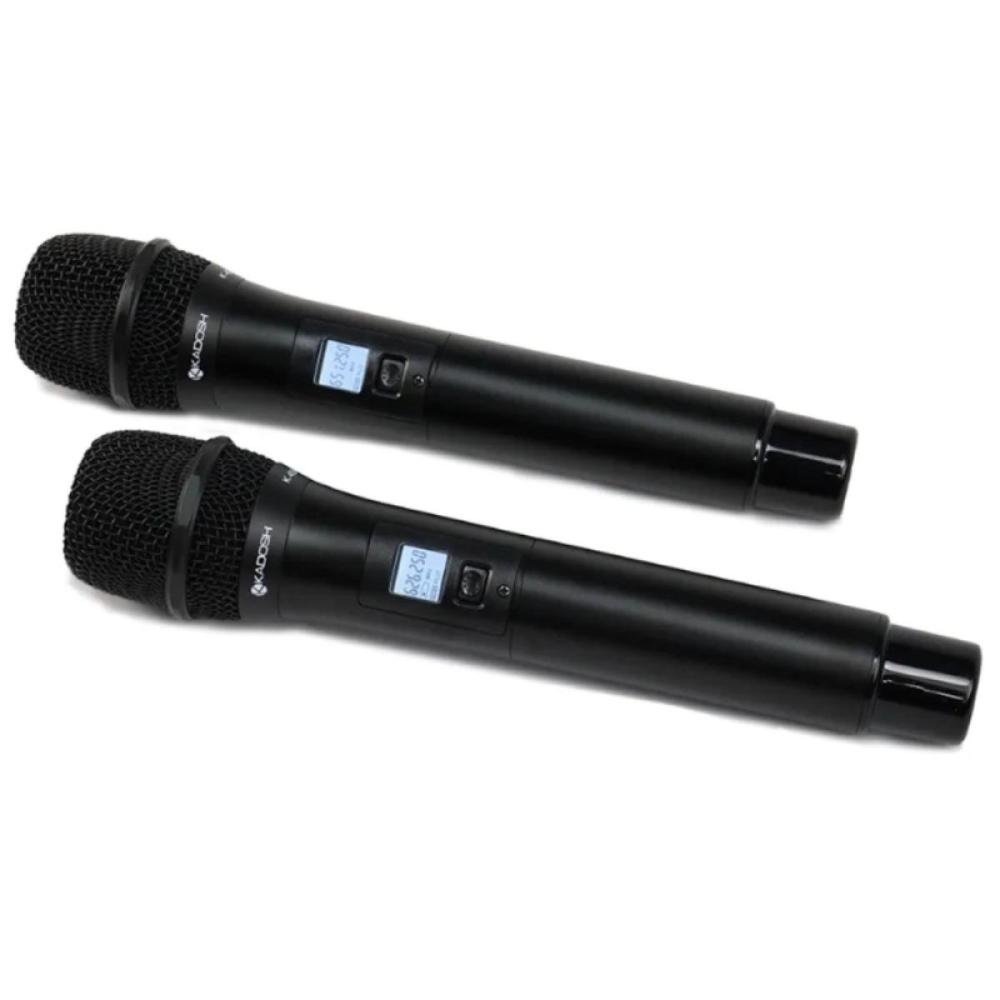 - Duplo microfone de mão em alumínio | - Cápsula Kadosh K4.9M (dinâmico/cardioide) | - Display LCD com informações