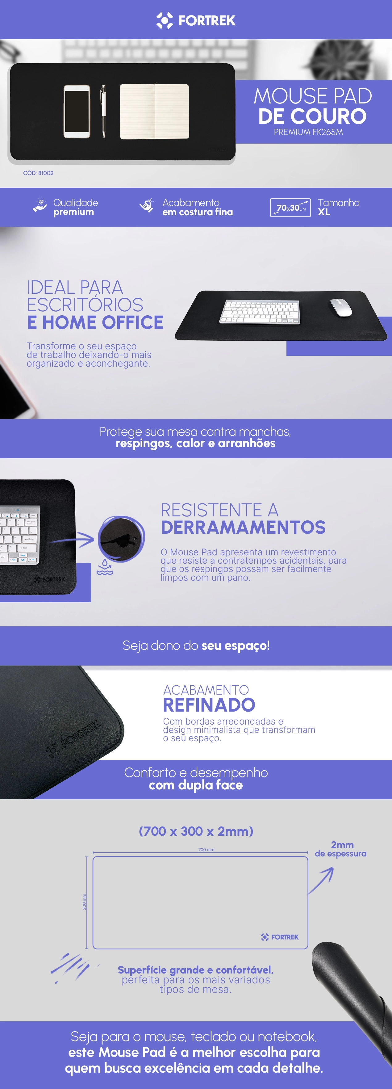 Mouse Pad de Couro Premium Fortrek FK 265M (700x300mm) Preto