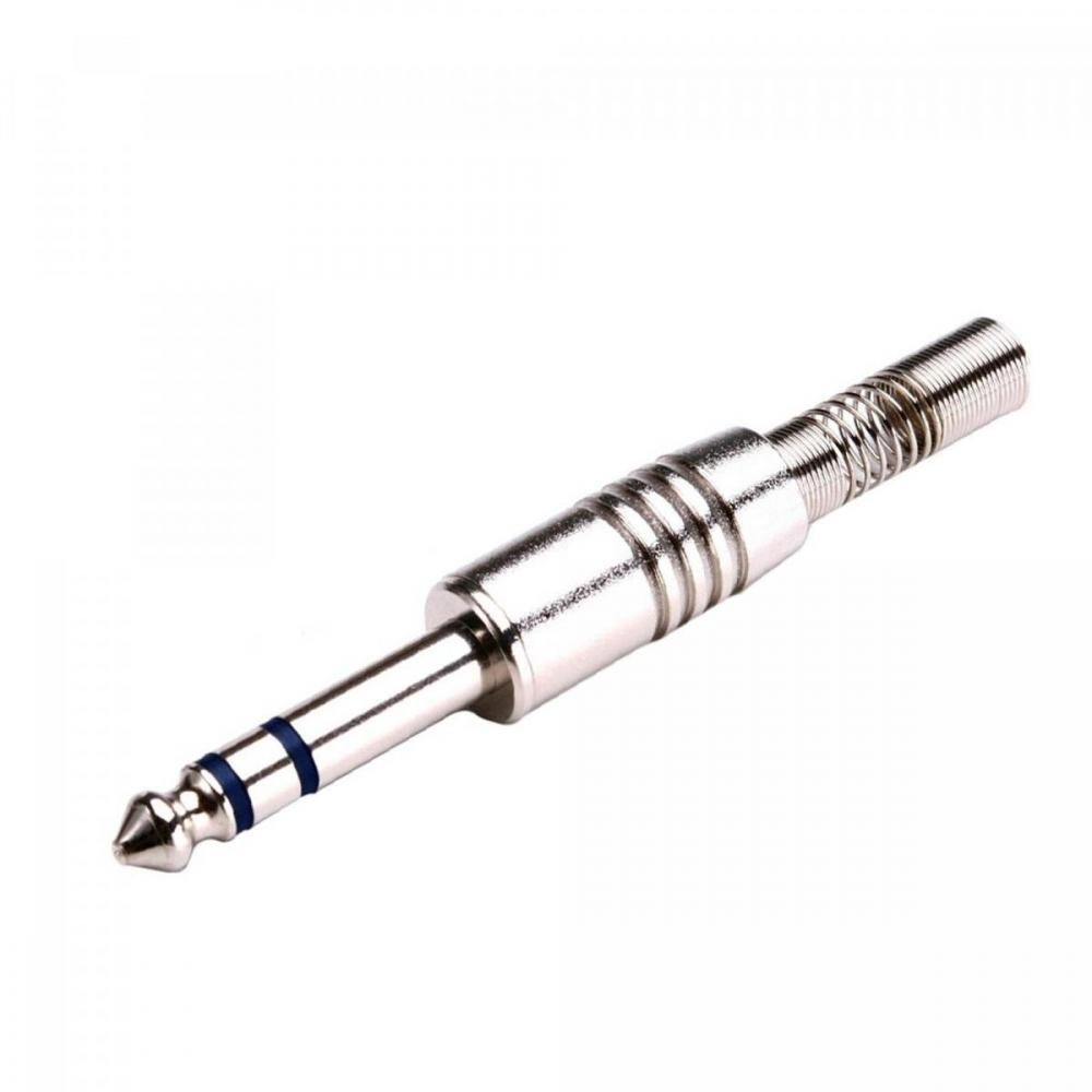 Conector P10 estéreo em latão niquelado. Possui mola de proteção do cabo e capa sextavada.