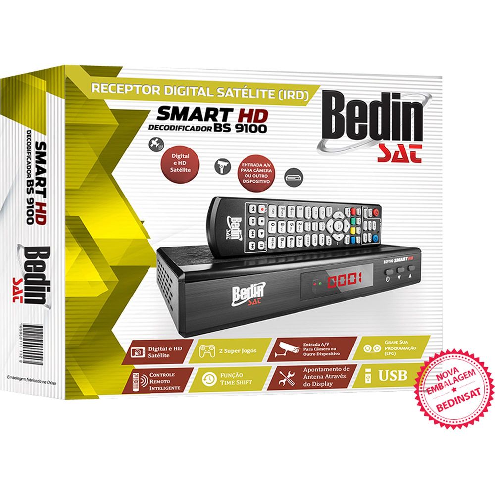Tipo de conexões: 1x LNB IN, 1x RCA IN (Vídeo), 2x RCA IN (Áudio), 1x USB e 1x HDMI