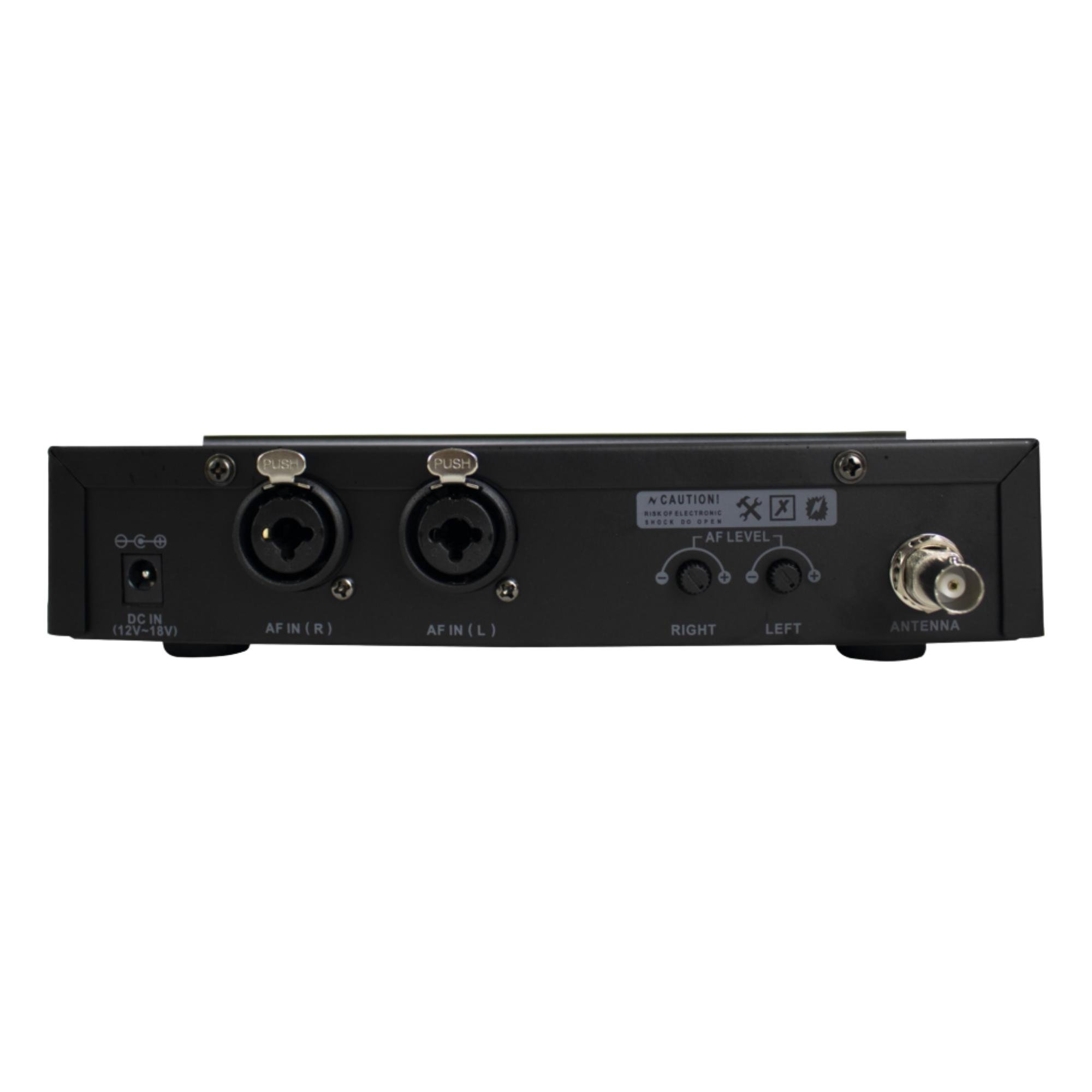 - Frequência de Trabalho: 500-600MHz | - Quantidade de canais: 16 | - Frequência do canal: 300KHz | - Alcance de até 50m | - Bodypack em plástico | - Antena removível  | - Rastreamento de canais  | - Frequências: 500-600Hz  | - Modulação: FM | - Fone de ouvido saida distorção: +10dB