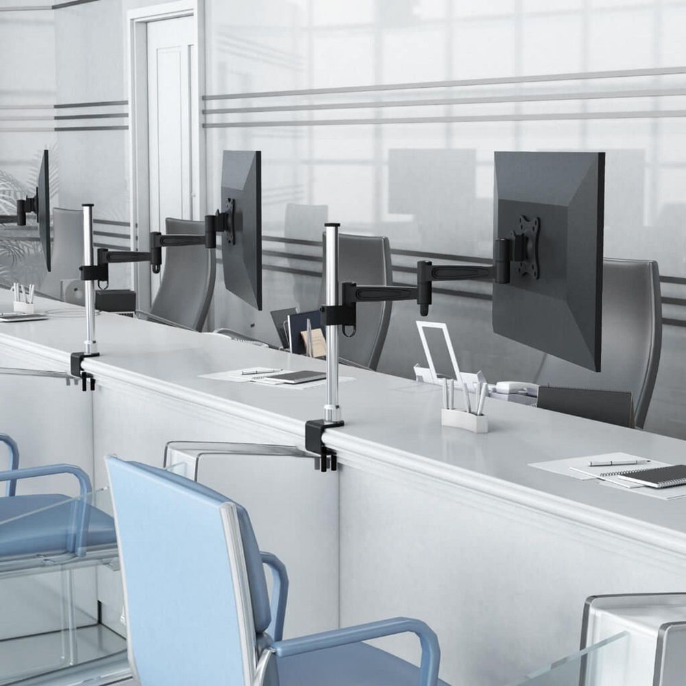 Um suporte de monitor fantástico para a sua casa ou escritório. É moderno, bonito e elegante. Possui ajuste de altura, fixação por morsa e não é necessário furar a mesa, permite modo retrato ou paisagem.