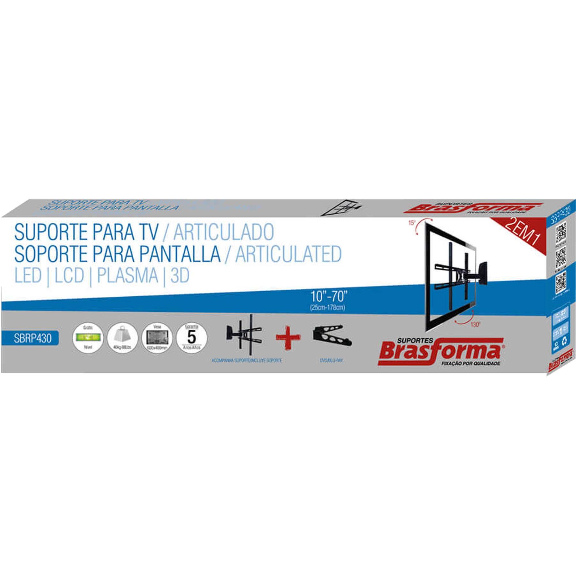 Suporte Articulado Brasforma para TVs LCD, LED, Plasma, 3D e Smart TV de 10 até 70 polegadas. Permite inclinação, articulação e rotação (3 movimentos). Permite Ajustar a TV para assistir de vários ângulos. Ideal para salas, escritórios, quartos, hospitais, restaurantes, entre outros locais.