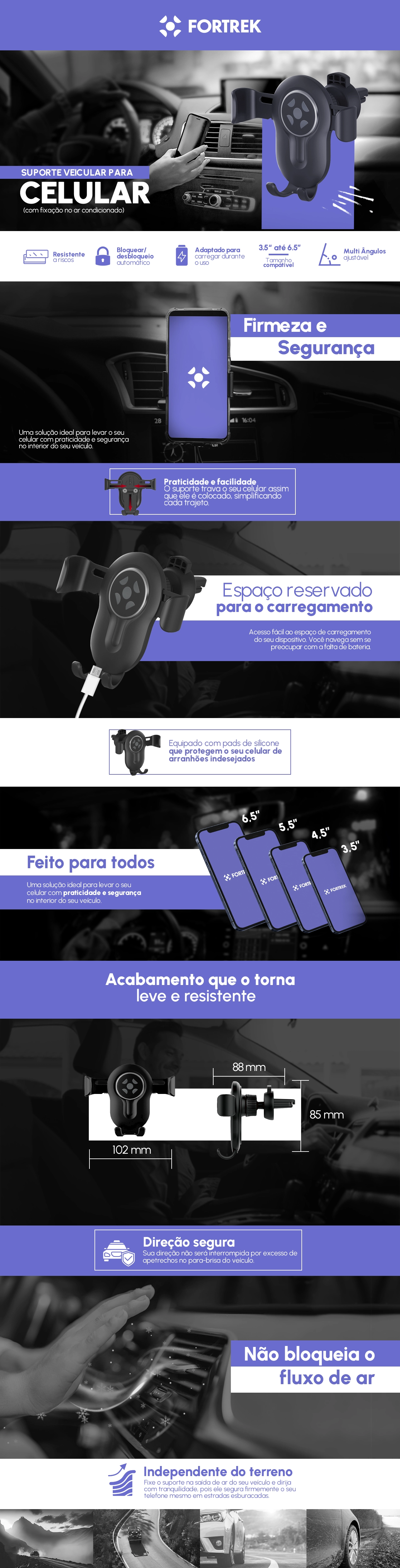 Além disso, sua universalidade torna-o compatível com a maioria dos modelos de carros e smartphones, eliminando a necessidade de adquirir suportes diferentes para cada dispositivo. Com design versátil este modelo proporciona uma solução prática e conveniente para diversas situações. Assim, o Suporte Para Celular Veicular da Fortrek é a escolha ideal para motoristas que buscam praticidade, segurança e versatilidade no uso de dispositivos móveis enquanto dirigem.