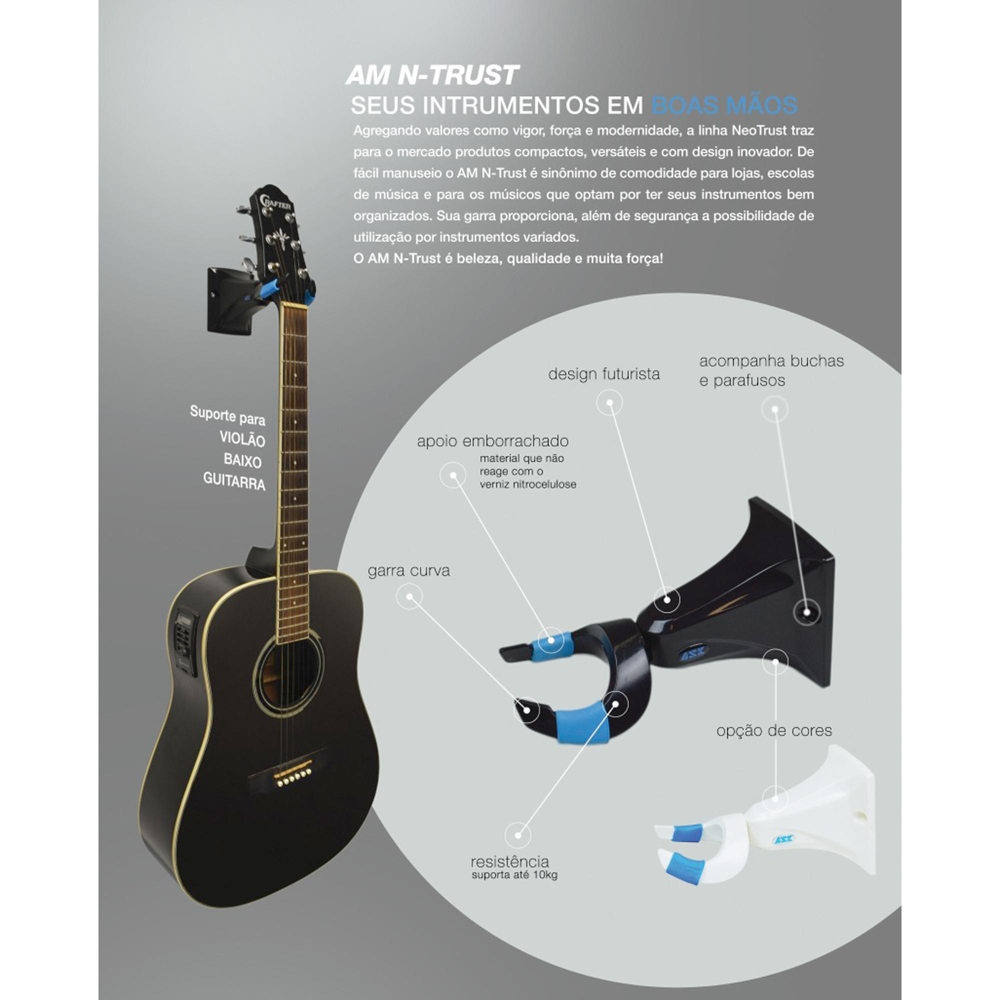 O AM N-Trust é um inovador suporte de parede para violão, guitarra e baixo. Compacto e seguro, possui design moderno e sofisticado, resultado da colaboração de músicos e engenheiros profissionais.