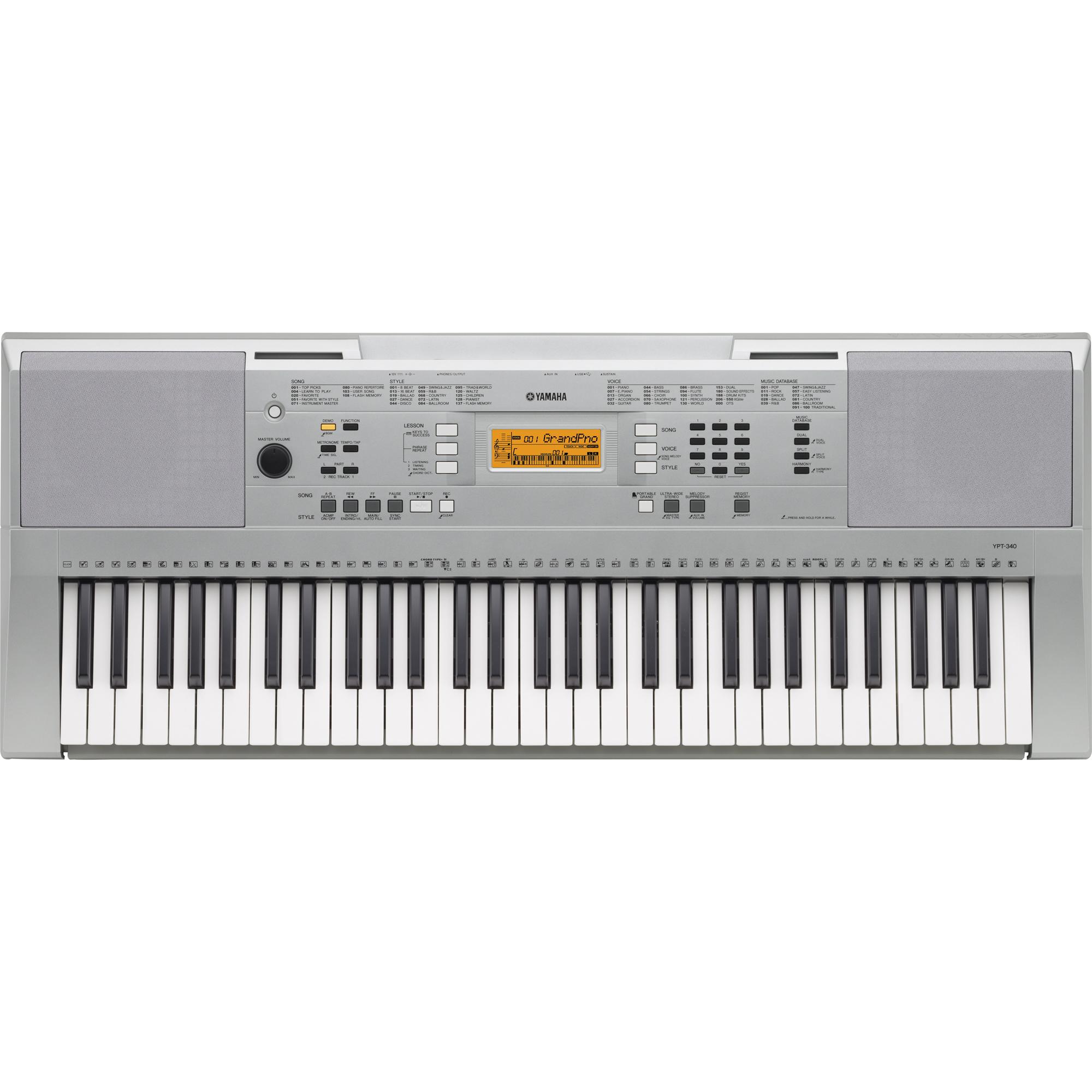 - Teclado sensível ao toque para maior alcance dinâmico, como num piano: Toque as teclas com firmeza para aumentar o volume do som, ou com menos força para baixar o volume. O YPT-340 irá reproduzir com fidelidade cada nuance do seu estilo de piano.