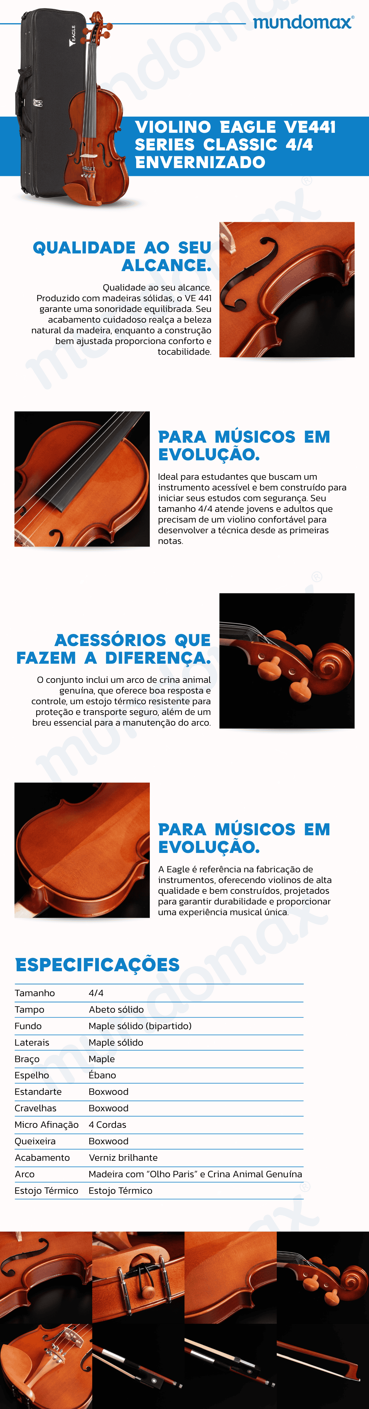 O Violino Eagle VE441 Series Classic é um dos grandes sucessos de vendas da Eagle. Isso porque possui uma das melhores relações custo x benefício do mercado, fornecendo Alta Qualidade em um instrumento com baixissimo preço. O VE441 permite uma perfeita regulagem do cavalete, do estandarte e da alma proporcionando harmonia ideal para uma melhor ressonância. Sua madeira selecionada faz com que o som tenha uma qualidade muito boa.